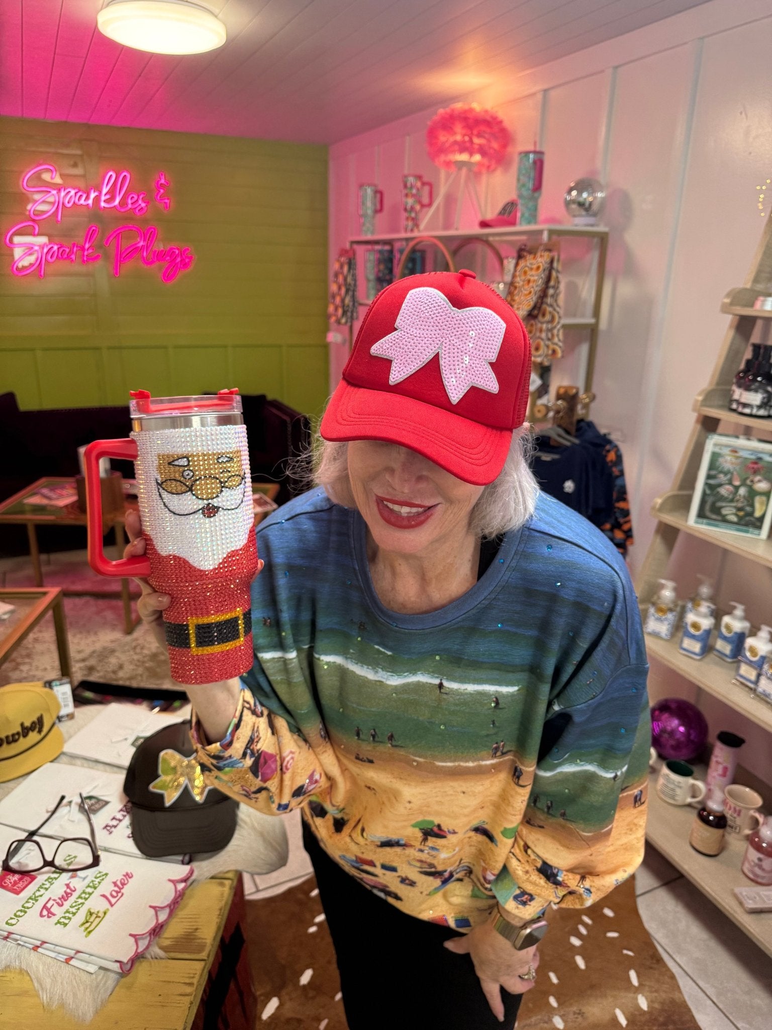Add a pop of fun and flair to your look with this red trucker hat featuring a sparkling pink sequin bow. Its adjustable design ensures a comfortable fit for all-day wear, making it perfect for sunny days or casual outings where you want to shine with a playful twist.