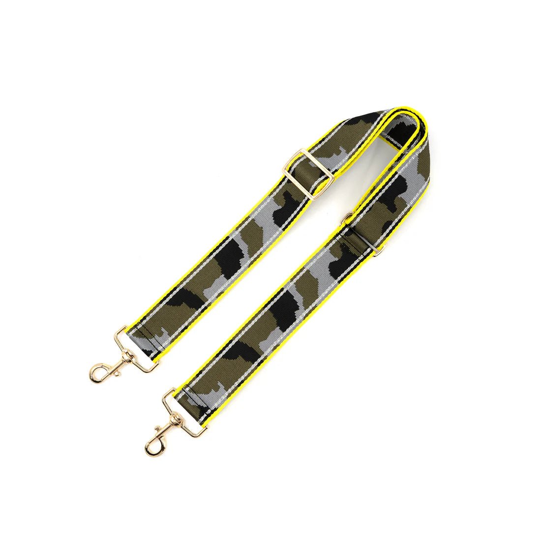 Refresh your favorite bag with a bold new edge. The Grey Camo with Neon Trim Strap blends rugged cool with a pop of modern color, featuring a sleek grey camouflage pattern framed by vibrant yellow accents. Crafted from durable woven fabric with smooth, reinforced edges, this adjustable strap is both eye-catching and comfortable to wear. Finished with polished metal clasps, it clips easily onto most handbags, giving your everyday carry a dose of confident, street-chic energy.