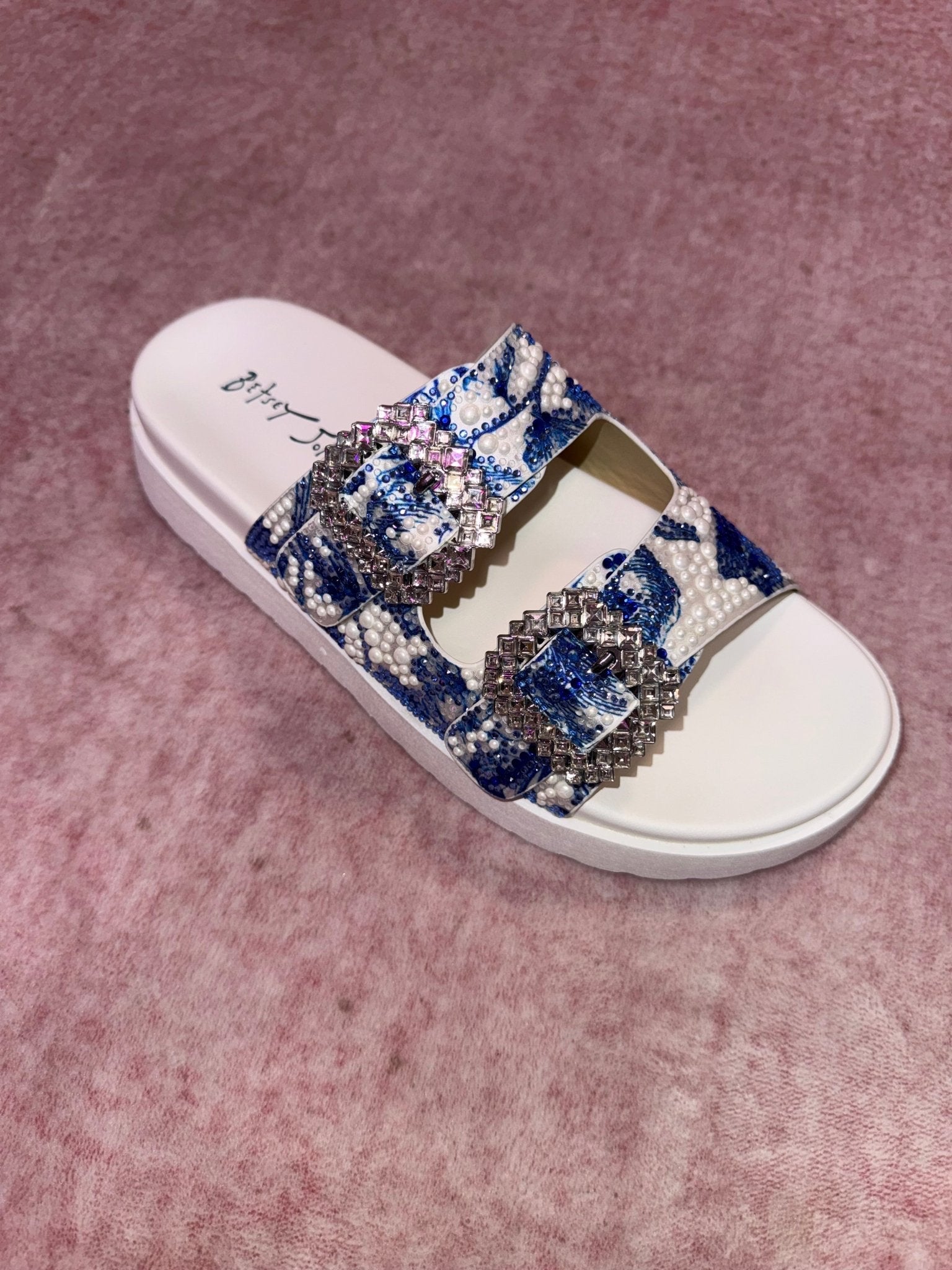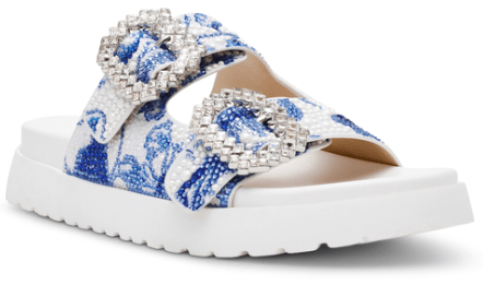 Step into sparkle and style with the Betsey Johnson SB Matie—a slide sandal that brings the fun! Featuring a vibrant blue floral print and a dazzling bling buckle detail, this playful pair adds instant personality to any warm-weather look. Comfortable enough for all-day wear, the easy slip-on design keeps you moving without missing a beat. Perfect for those who love a little glam with their casual vibes.