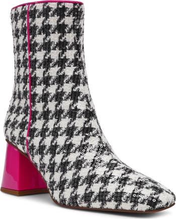 Step into style with Betsey Johnson's Stevie Houndstooth Booties. Featuring a bold houndstooth pattern and a playful 2 1/2" heel, these booties add flair to any outfit. The 8" shaft and back zip closure ensure a snug, comfortable fit, while the textile upper and synthetic lining provide lasting wear. Perfect for turning everyday moments into statement-making occasions.