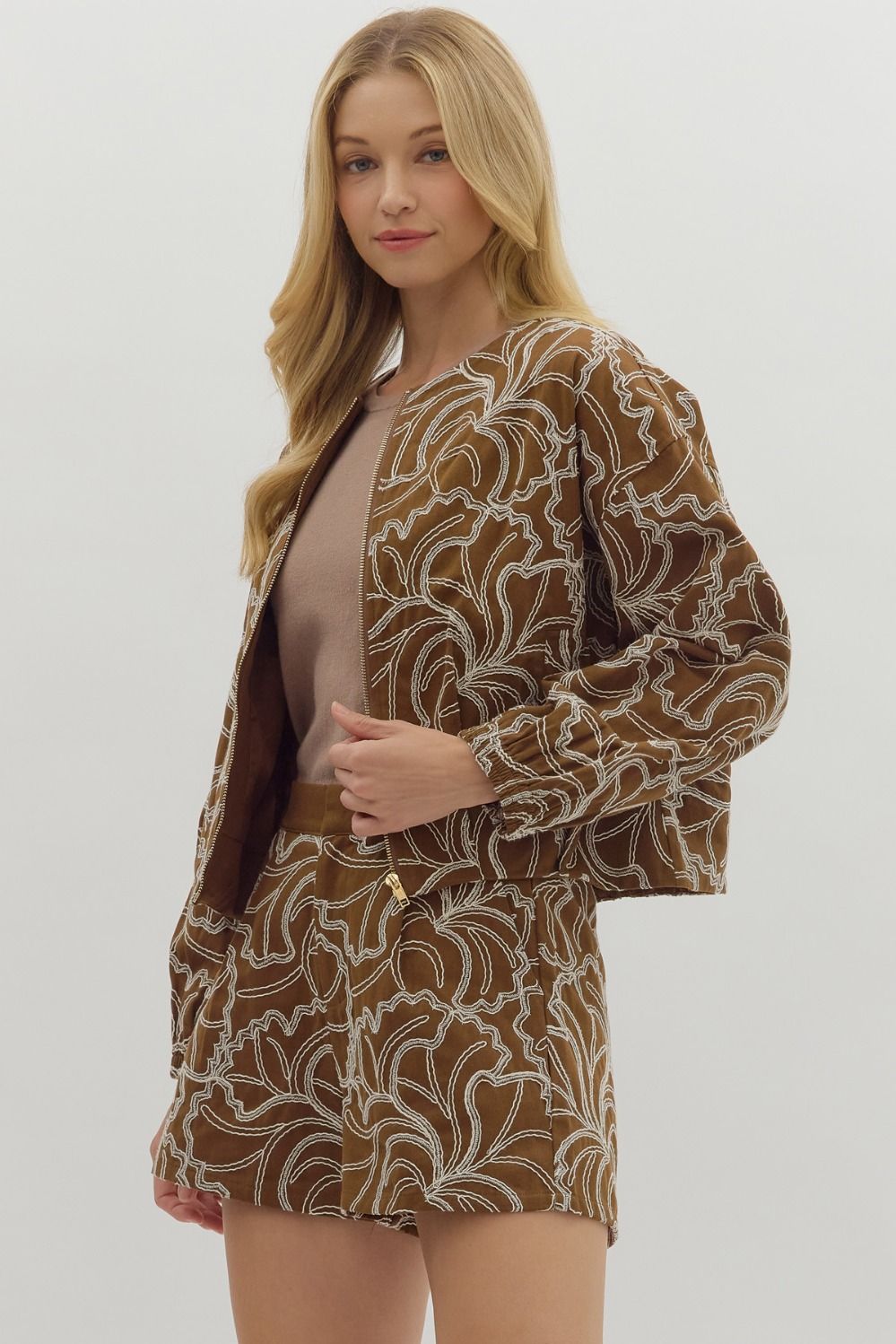 Add a splash of charm to your wardrobe with the Toffee Bloom Embroidered Jacket! This textured, long-sleeve crop jacket zips up for an easy, breezy look and features delightful floral embroidery that brightens any outfit. With handy side pockets, it’s as practical as it is pretty—perfect for keeping essentials close while you play it cool. (Jacket only)