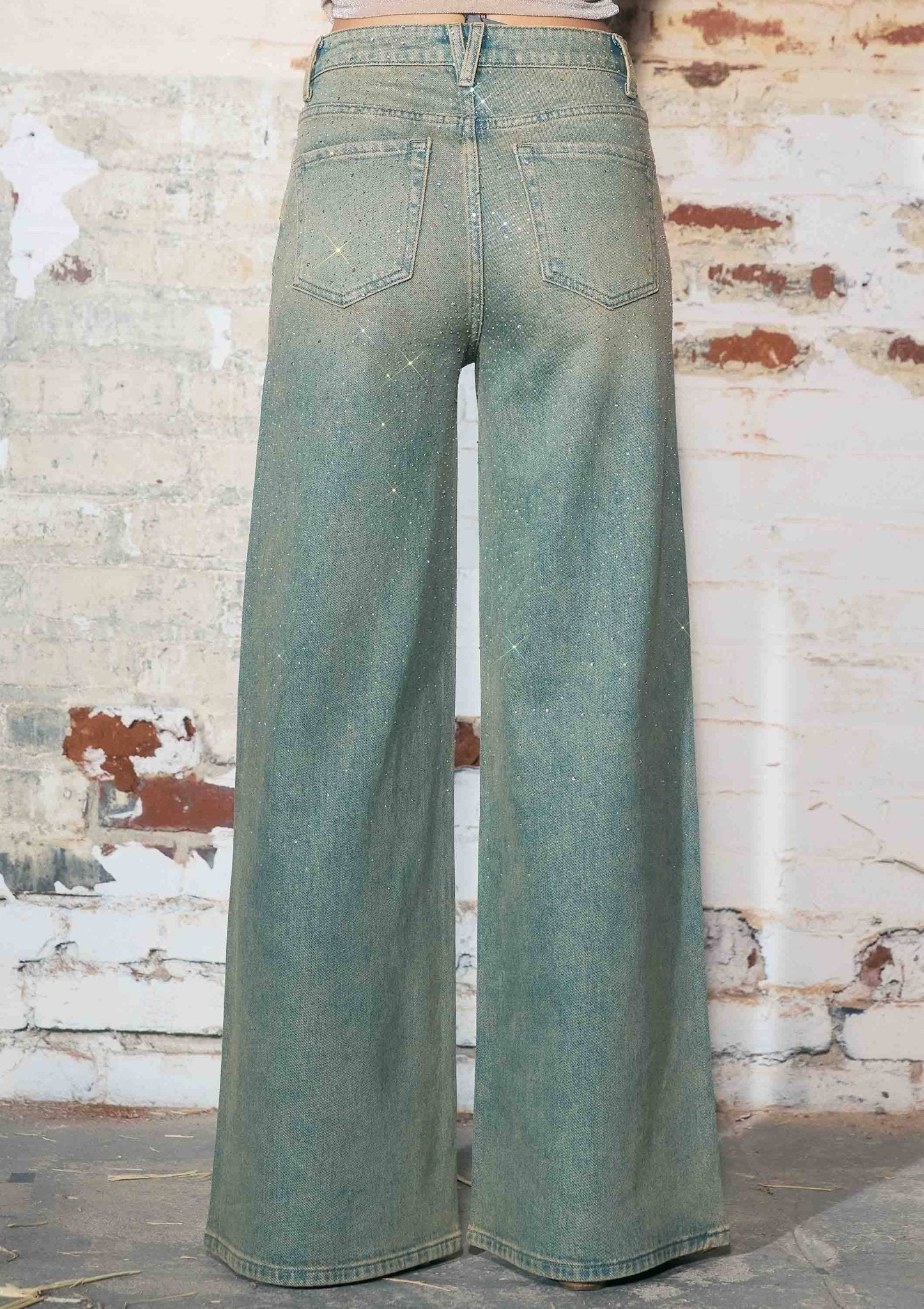 A pair of wide leg jeans featuring all over rhinestone detail, classic 5-pocket construction and a zip-fly closure.