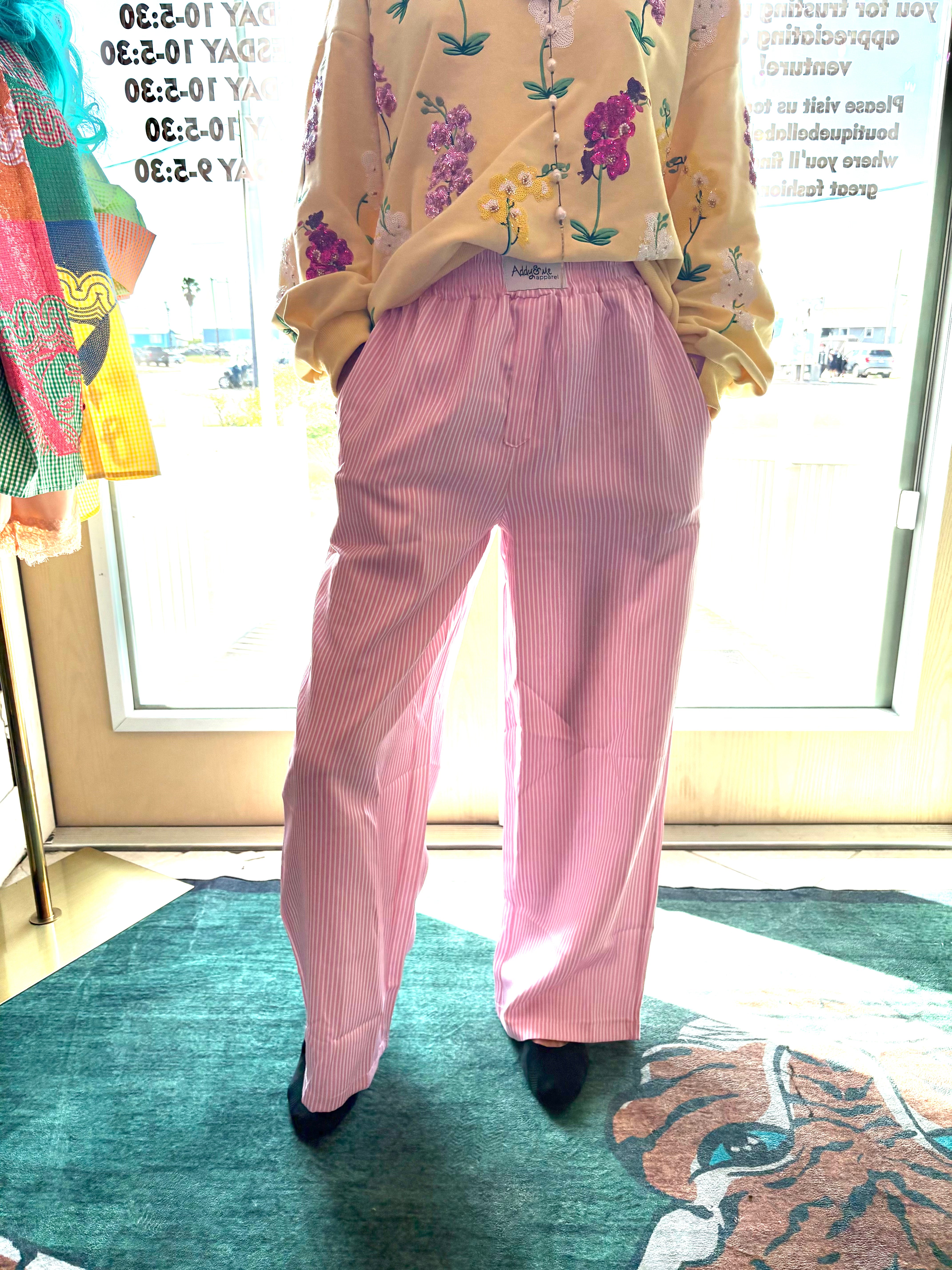 Effortless style meets comfort in these pink and white striped pants. The classic vertical stripes create a flattering, elongating effect while the soft fabric moves with you throughout your day. Perfect for casual outings, weekend brunches, or relaxed office settings. Pair with a solid top to let the stripes shine, or layer with a striped shirt for a bold, coordinated look. A versatile wardrobe essential that transitions seamlessly from season to season.