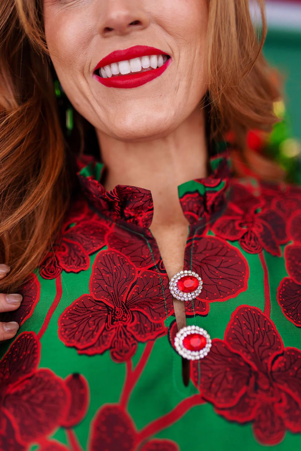 Brianna's signature caftan channels retro glamour with a modern twist, inspired by the golden age of 1960-70s fashion. This whimsical yet sophisticated piece features a stunning ruby red holiday orchid pattern paired with a statement ruffled neckline adorned with jeweled button accents for that coveted luxe finish. Crafted from 100% polyester, the lined silhouette includes hidden pockets—because style should never sacrifice practicality. Perfect for making a bold, elegant entrance at any celebration.