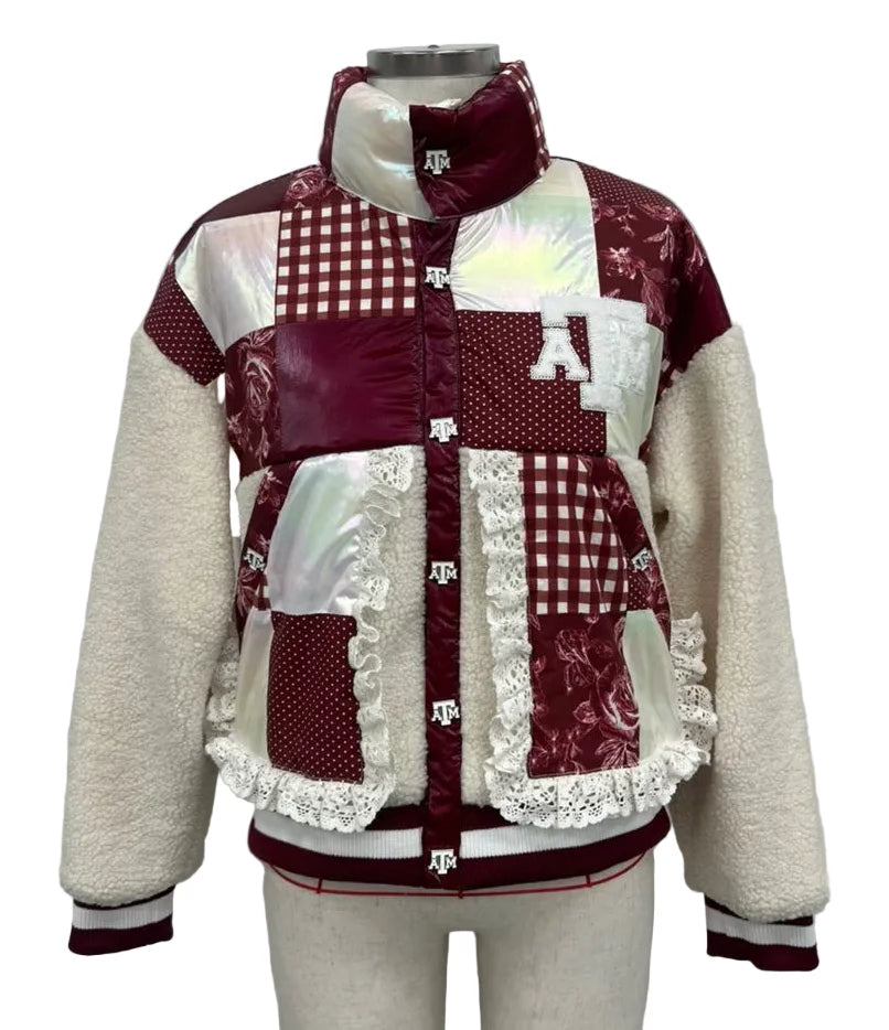 Wrap yourself in Aggie pride with this cozy patchwork sherpa jacket! Featuring a fun mix of textures and colors, this piece celebrates your Texas A&M spirit in style. The soft sherpa lining keeps you warm during chilly days, while the patchwork design adds character and charm. Perfect for game days, campus strolls, or casual hangouts with fellow Aggies. Layer it over your favorite outfit and show your school loyalty with every wear!