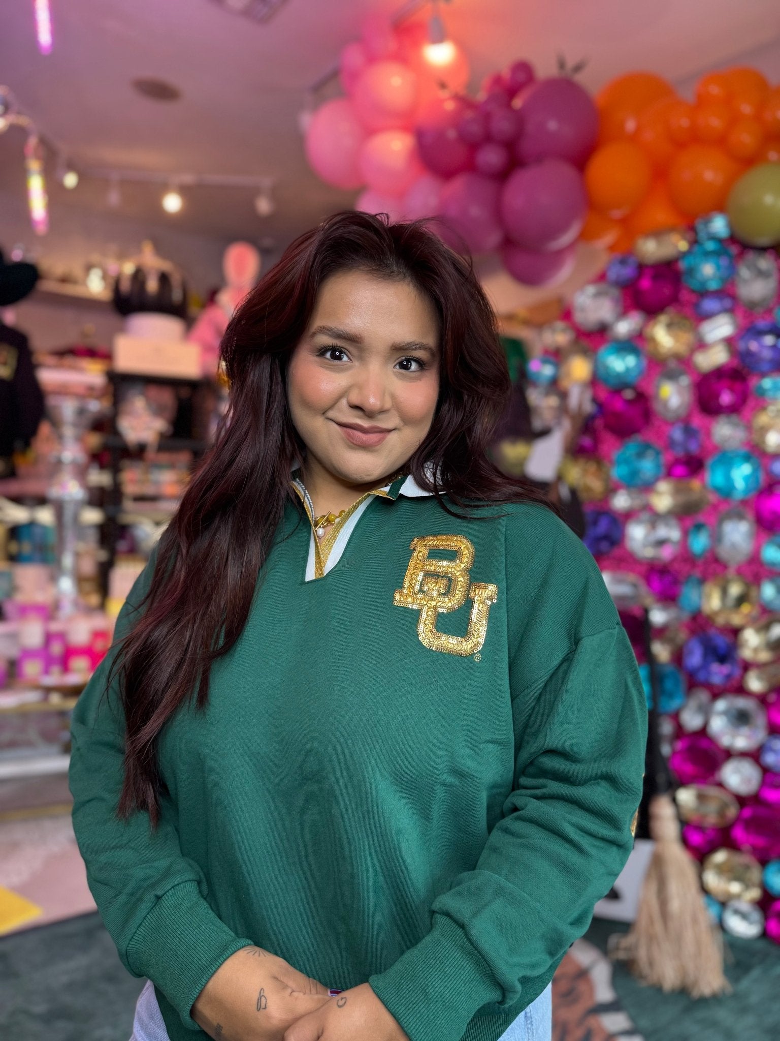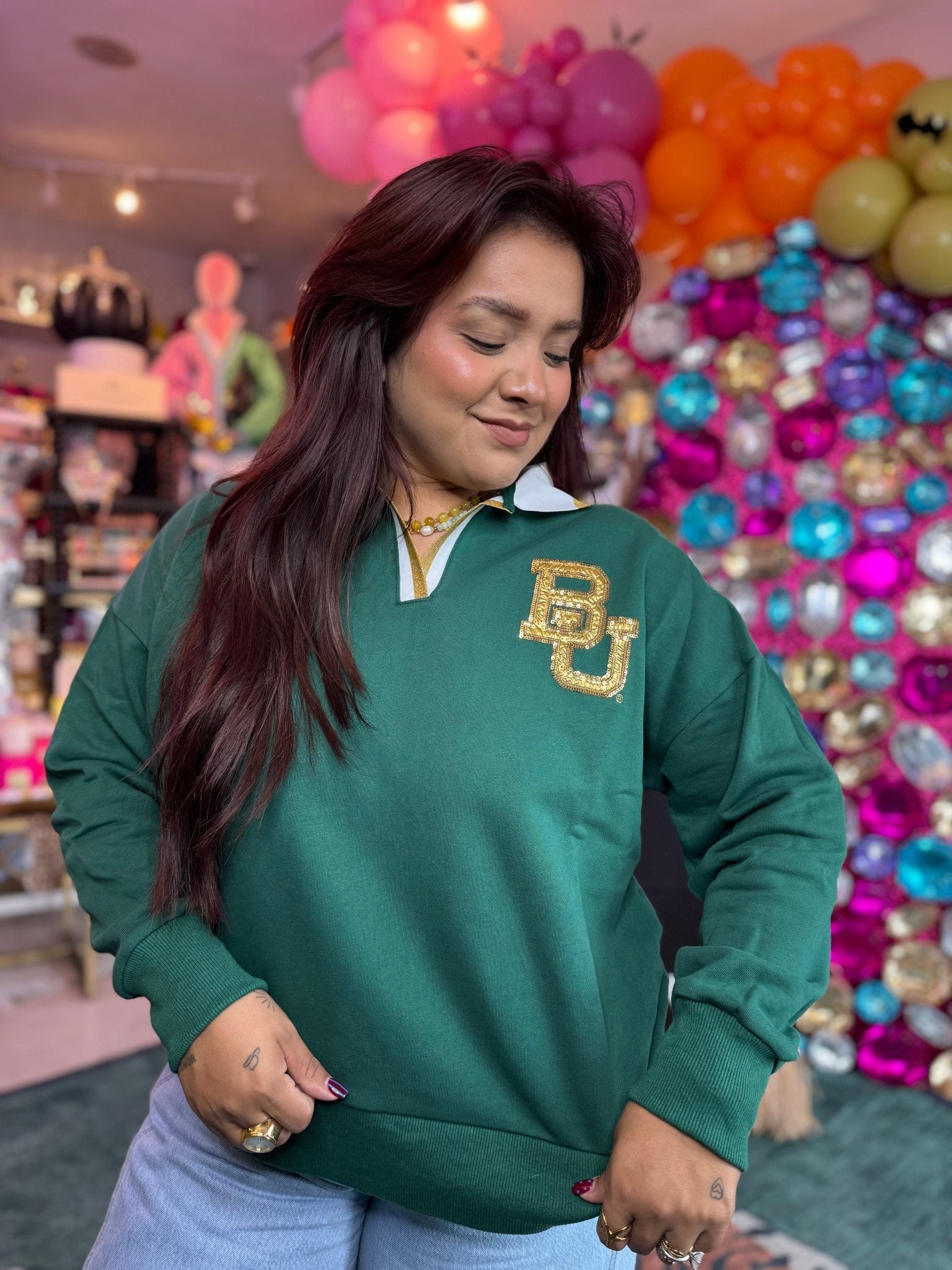 University logo on front with sequins, embroidery, and appliqué details