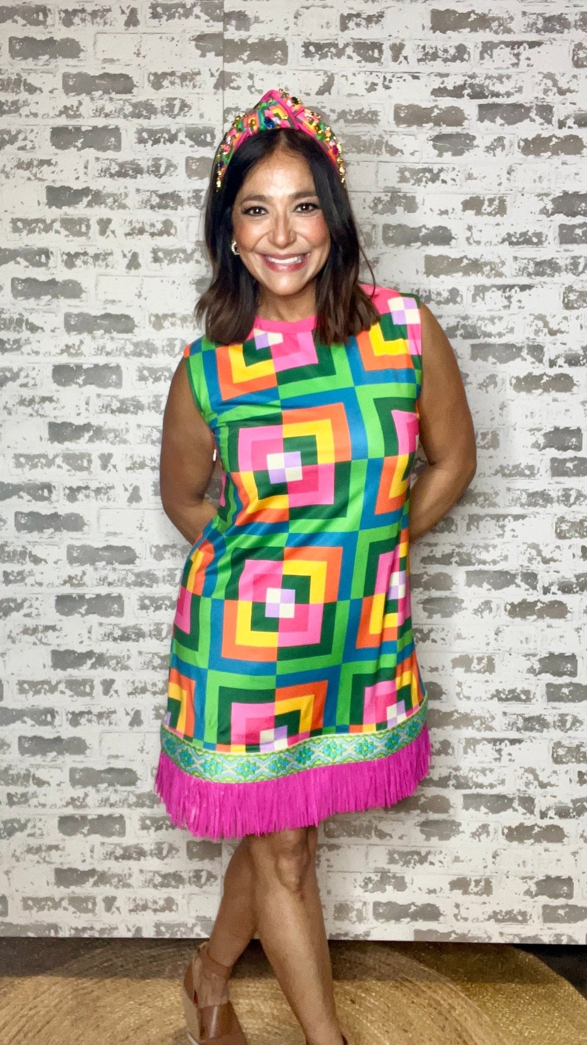 Get groovy in this kaleidoscope cutie! With its vibrant geometric print and eye-catching fringe hem, this sleeveless shift dress is a full-on retro party. Bold, bright, and impossible to ignore, it’s made for dancing under disco balls or stealing the spotlight wherever you go.