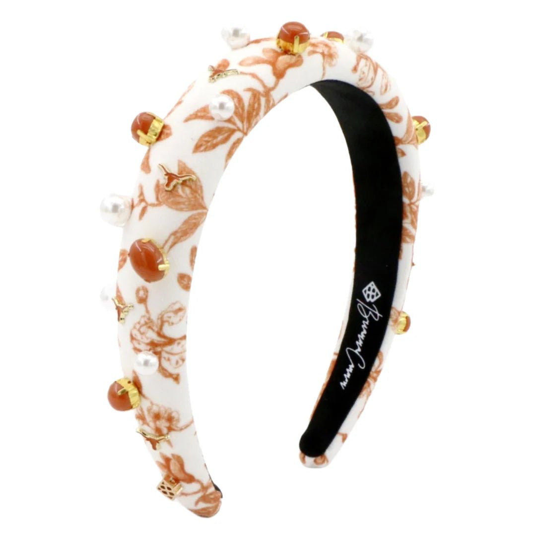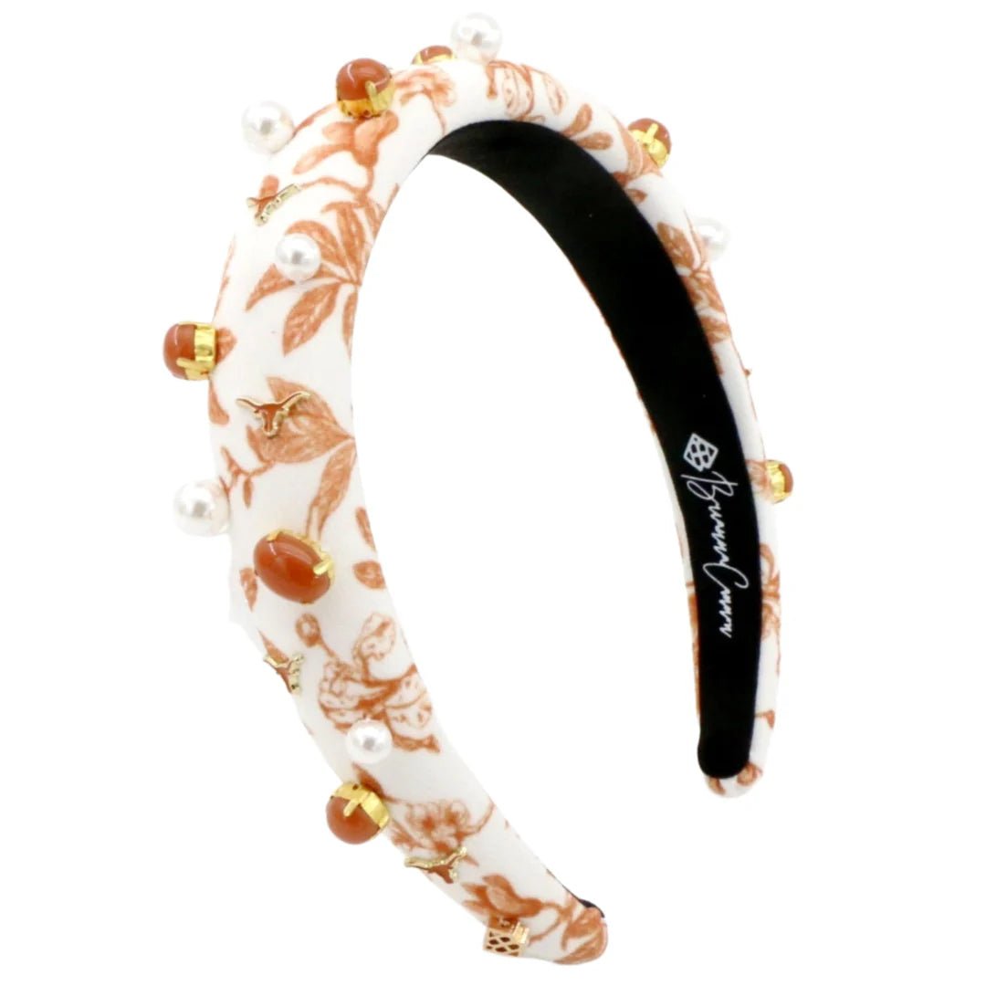Floral Toile Headband with gold plated University of Texas Logo Charms, Hand-Sewn Cabochon Beads, and Pearls