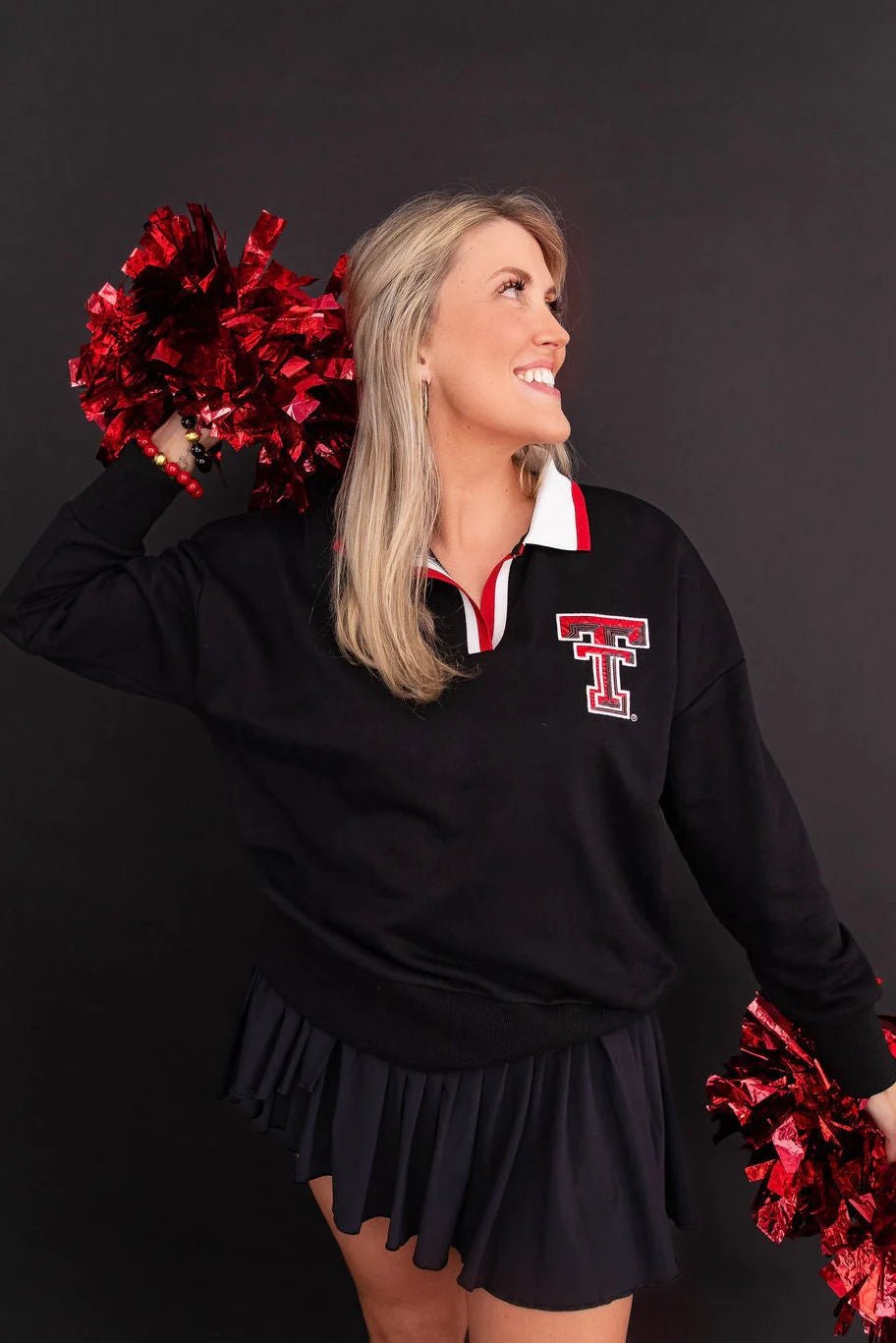 Team lettering across the back of the sweatshirt in fabric appliqué with embroidery