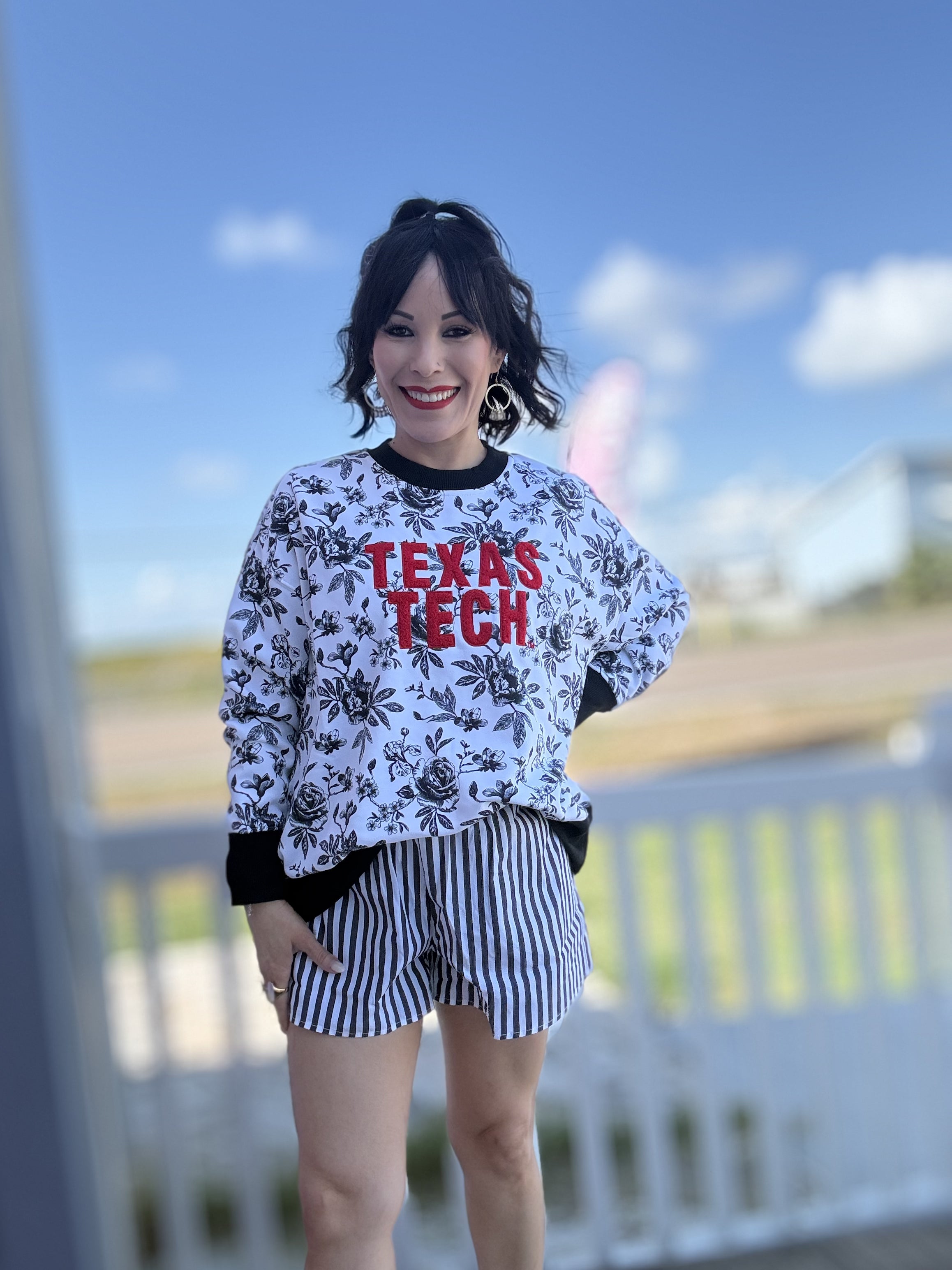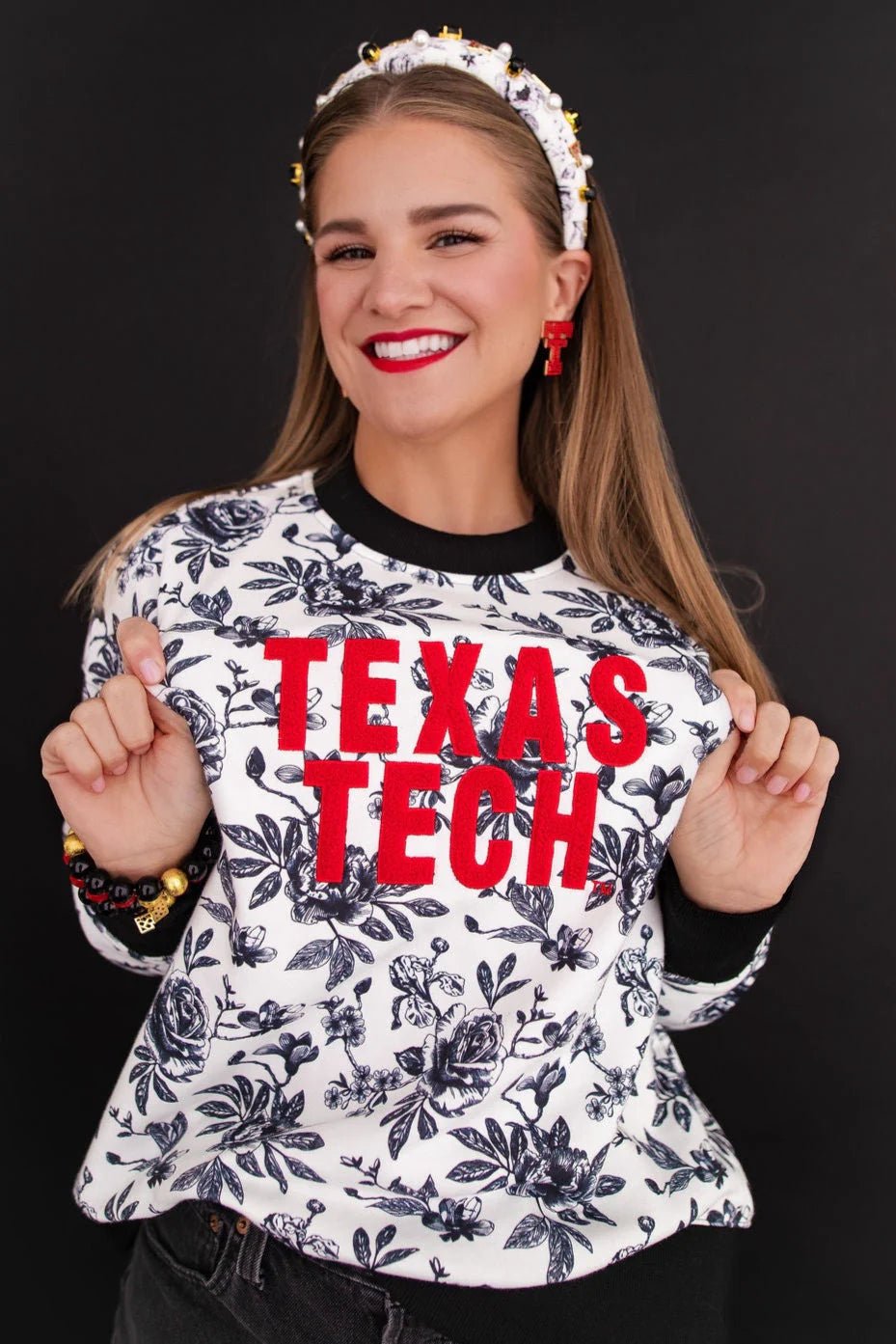 Elevate your gameday look with this oversized cotton sweatshirt featuring feminine, floral toile motif in team colors