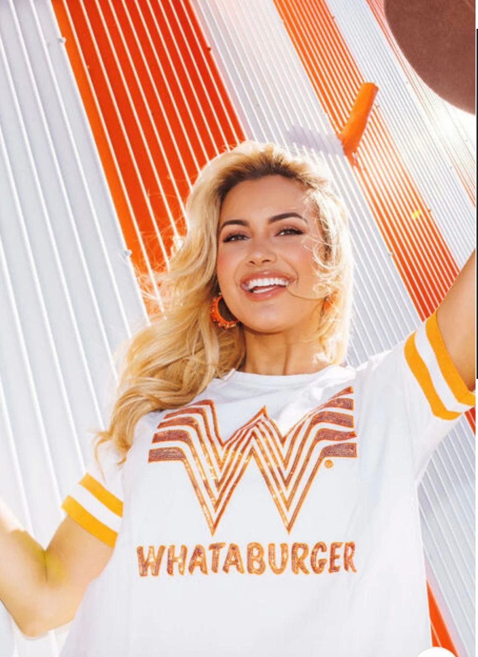 Celebrate your love for Whataburger with this eye-catching white sequin tee featuring the iconic Brianna Cannon lockup design. The shimmering sequin detailing adds a fun, festive touch to a classic casual staple. Perfect for game days, casual outings, or showing off your Whataburger pride in style. Comfortable cotton blend construction keeps you feeling great all day long.