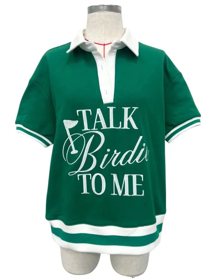 Swing into style with this playful green short sleeve sweatshirt designed for golf enthusiasts. Featuring a crisp white collar, coordinating sleeve stripes, and hem detailing, it delivers a polished, sporty aesthetic both on and off the course. The charming "Talk Birdie To Me" graphic with golf flag accents brings personality to every wear. Crafted from soft cotton terry (80% cotton, 20% polyester) for comfort that lasts. Note: This style runs oversized—wear your normal size for the relaxed fit or size down for a more tailored silhouette.