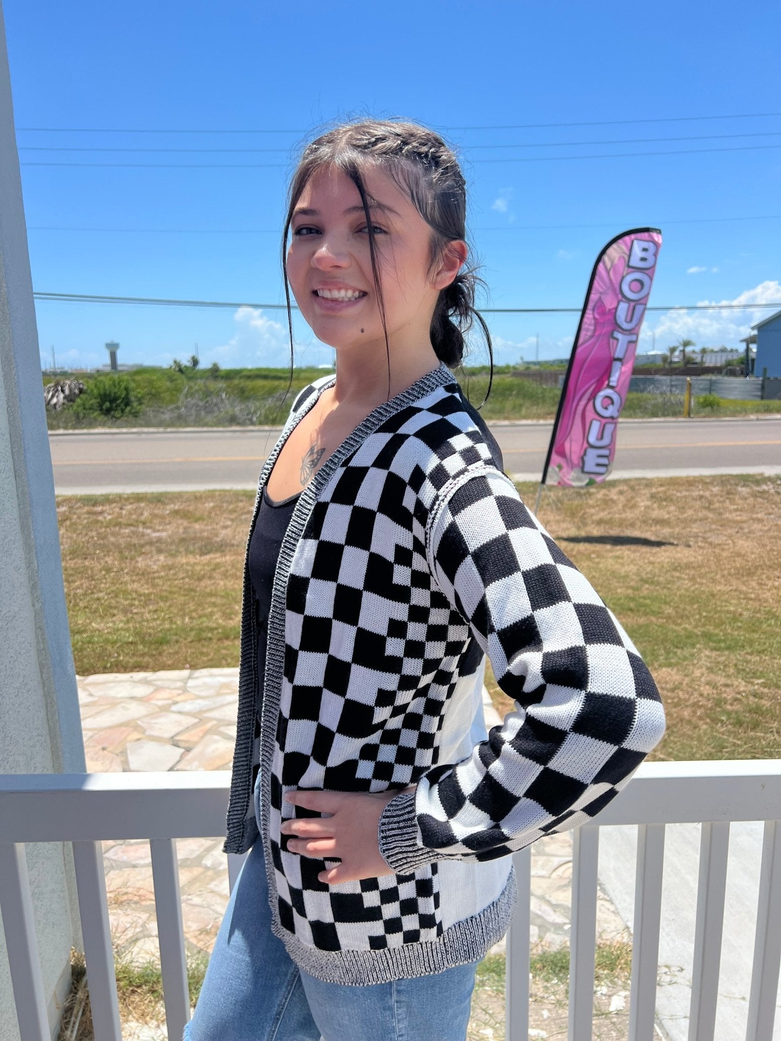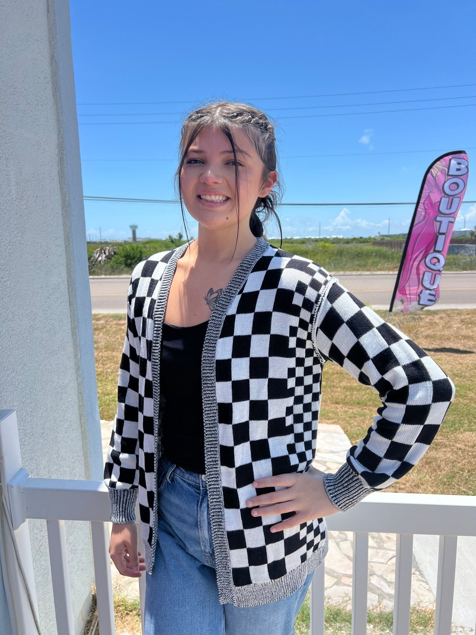 Wrap yourself in playful sophistication with the Checkmate Chic Cardigan. Its bold pattern adds a fun twist to any outfit, making it perfect for those who love to stand out with style. Cozy yet lightweight, this cardigan effortlessly blends comfort with sharp fashion, ideal for layering during cooler days or breezy evenings. Let your wardrobe make the first move with this charming, checkered classic.