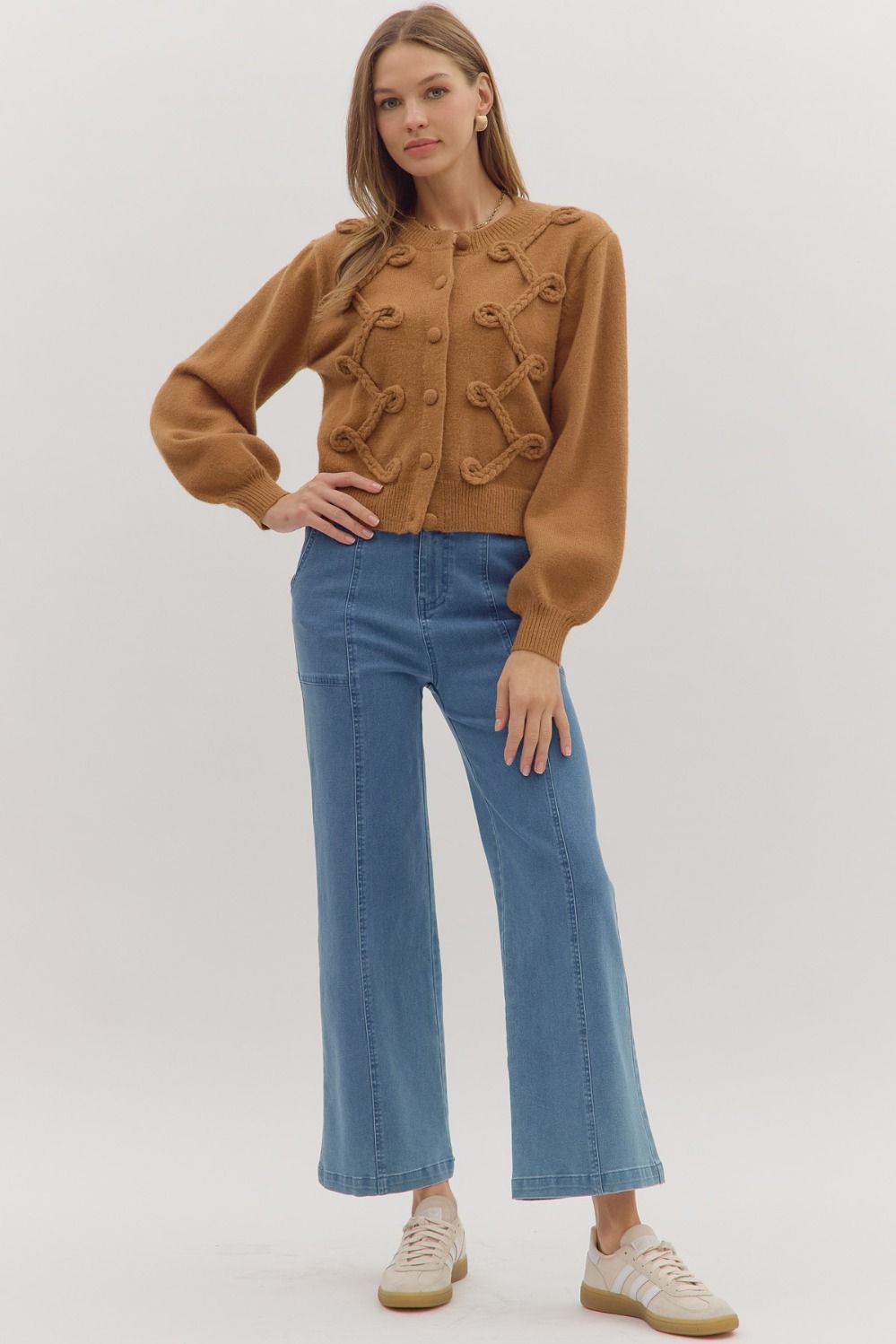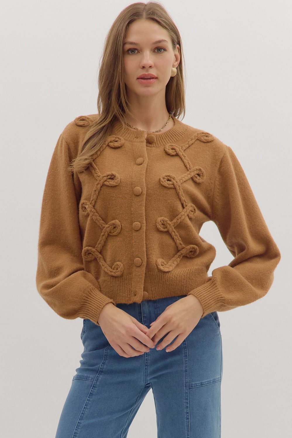 Cozy meets classic in The Caramel Loop Cardigan. Designed in a warm camel hue, this medium-weight knit features a unique looped trim detail along the front for subtle texture and charm. The long sleeves and front button closure offer timeless comfort, while the unlined, non-sheer construction makes it perfect for layering season after season. Whether draped over a dress or paired with your go-to denim, The Caramel Loop adds effortless polish with a hint of sweetness.