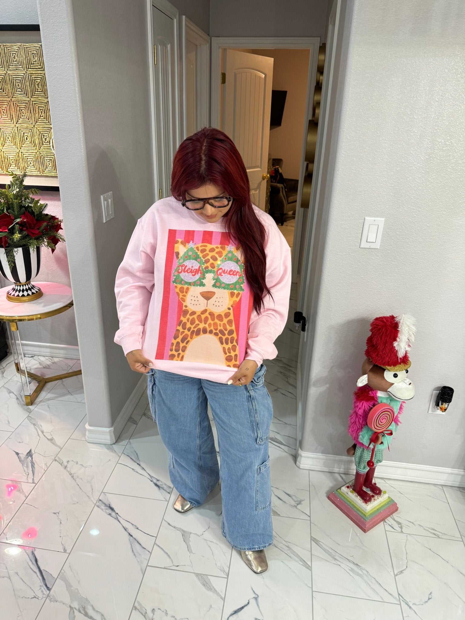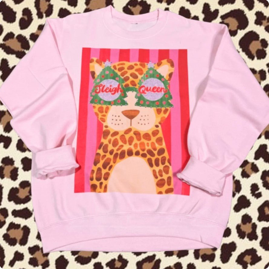 Turn heads and sleigh all season long in this festive leopard sweatshirt!! Featuring an adorable leopard decked out in glittery green holiday glasses that read "Sleigh Queen", this playful design pops against bold pink-and-red stripes for the perfect mix of merry and fierce. Cozy, soft, and full of sass, it's the must have statement piece for every queen who rules the holidays in style. Perfect for parties, shopping days, or just spreading cheer everywhere you go!!!