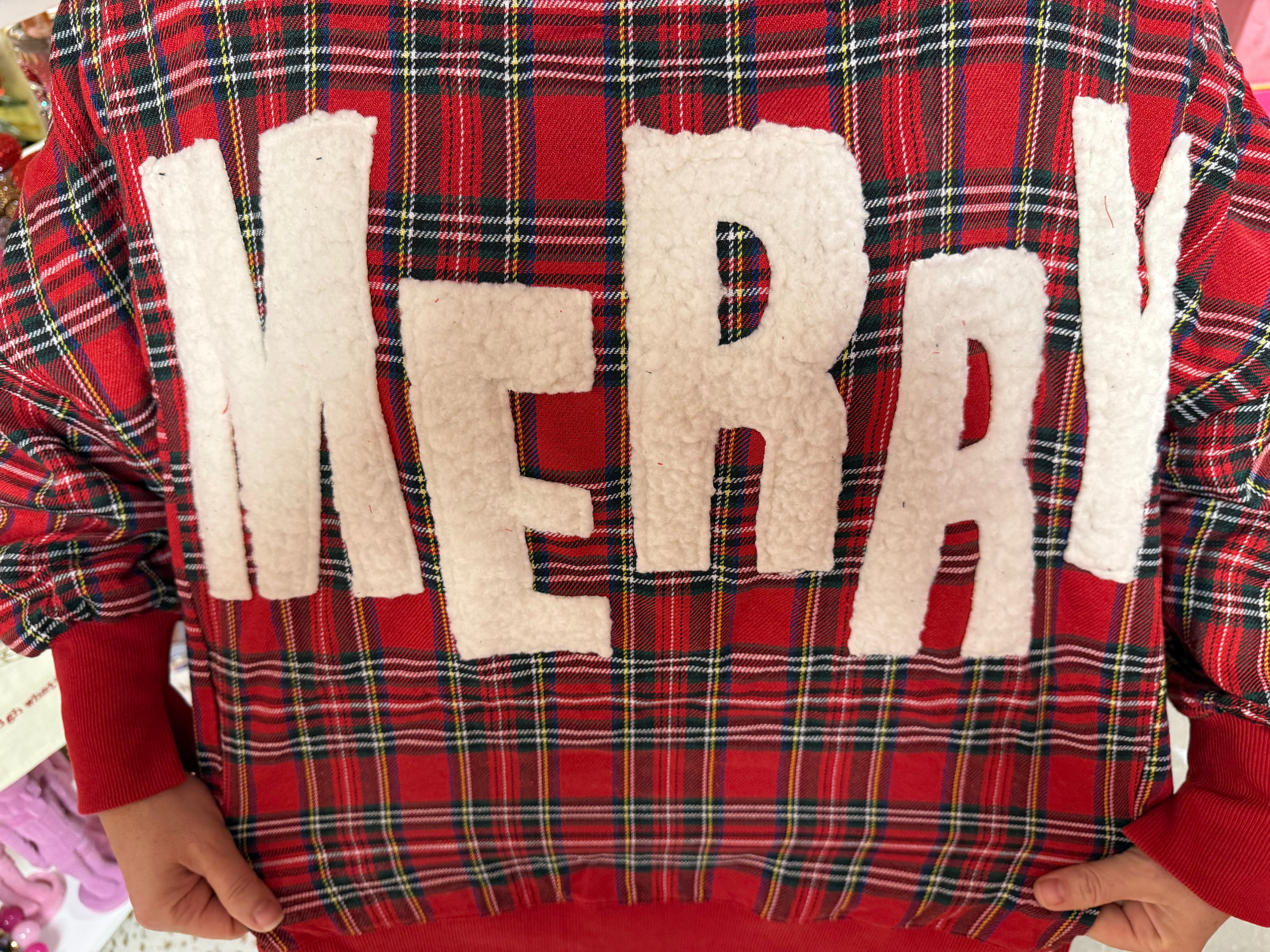 Wrap yourself in holiday cheer with this charming red tartan plaid pullover, featuring the word “Merry” in soft, white fuzzy letters. The classic plaid pattern brings timeless Christmas style, while the textured lettering adds a cozy, playful touch. Perfect for holiday parties, family photos, or staying warm in seasonal style, this pullover is equal parts comfy and festive.