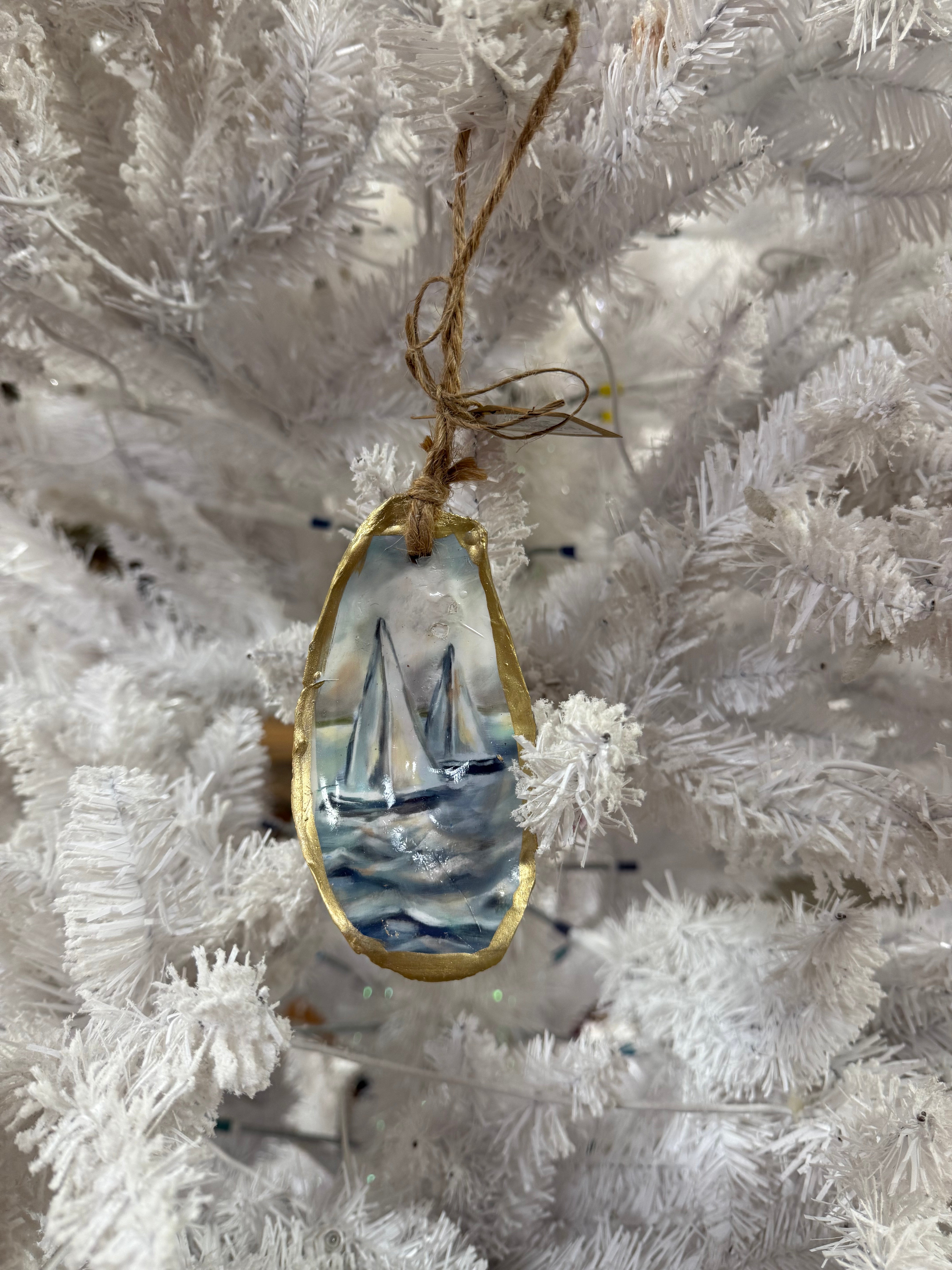 Add a splash of seaside charm to your decor with this Oyster Boat Scene Ornament. Delicately crafted to feature a serene boat scene nestled within an oyster shell, it’s a playful tribute to coastal adventures and ocean breezes. Perfect for bringing a touch of nautical whimsy to any space or holiday tree.