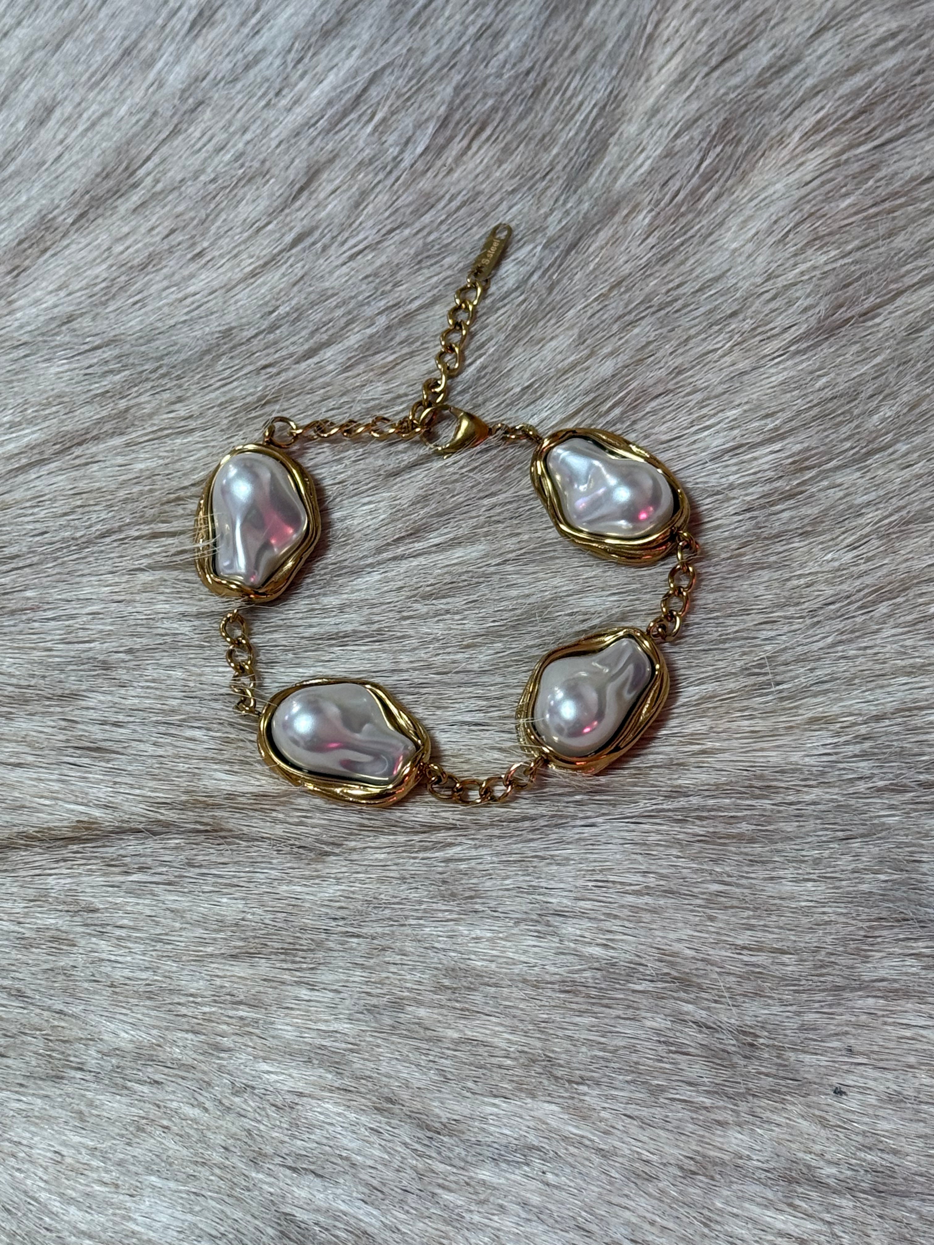 Wrap your wrist in pure joy with the Gilded Tide Pearl Bracelet, featuring four stunning 1-inch pearls that radiate timeless elegance. Each pearl is a little treasure, perfectly sized to make a subtle yet sophisticated statement. The golden setting complements the lustrous sheen beautifully, creating a bracelet that's equally at home at brunch or a black-tie event. Simple, stunning, and endlessly wearable—this is the piece you'll reach for again and again.