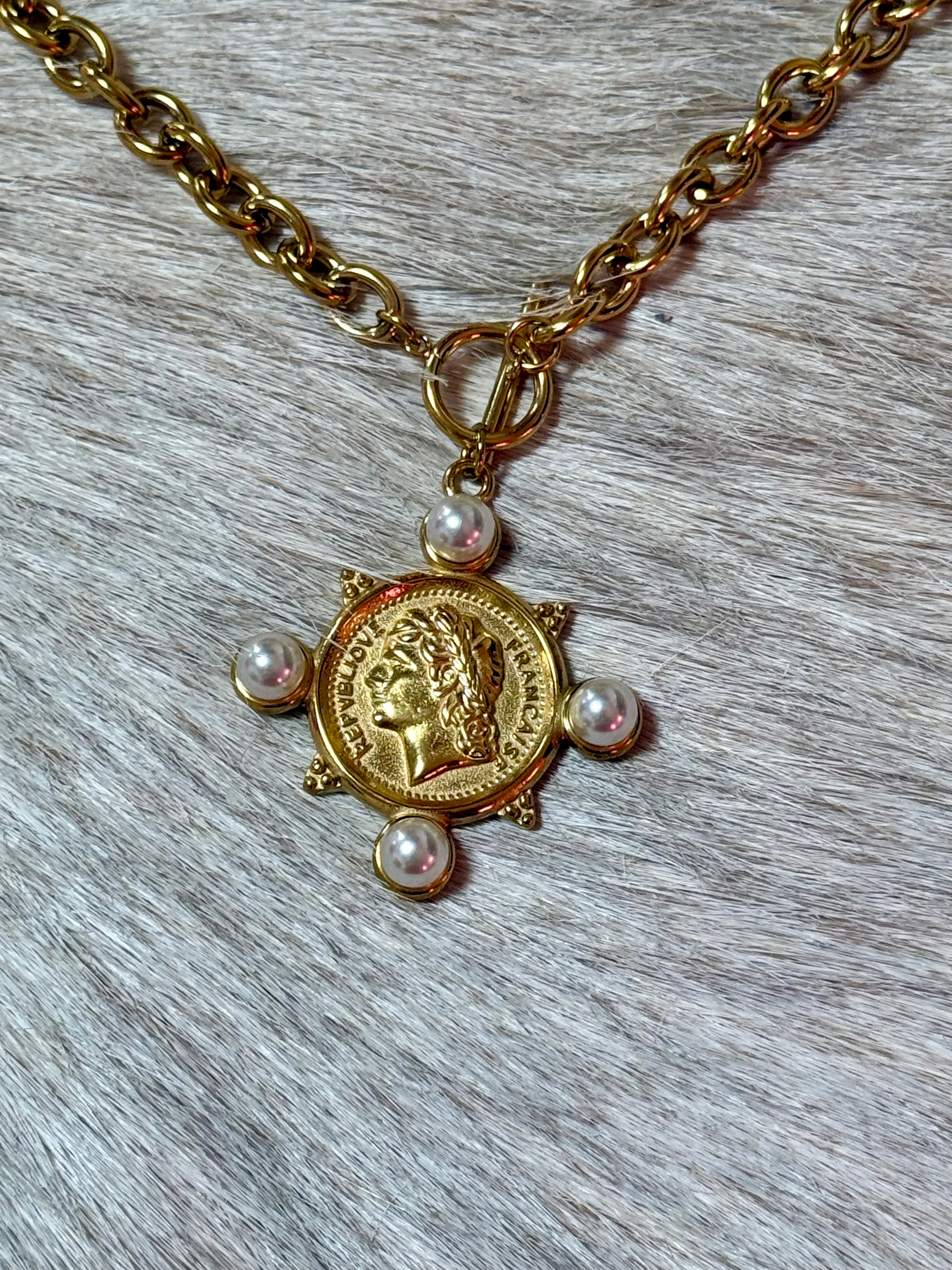 Elevate your everyday elegance with the Pearl Empress Coin Necklace, where timeless sophistication meets playful charm. This stunning piece features a striking coin pendant adorned with four lustrous pearl-like stones arranged in perfect symmetry, creating a regal focal point that catches the light beautifully. Available in two sizes, you can choose the perfect fit for your personal style. Whether you're dressing up for a special occasion or adding a touch of glamour to your casual look, this necklace brings an air of refined luxury to any outfit. A true statement piece that celebrates your inner empress.