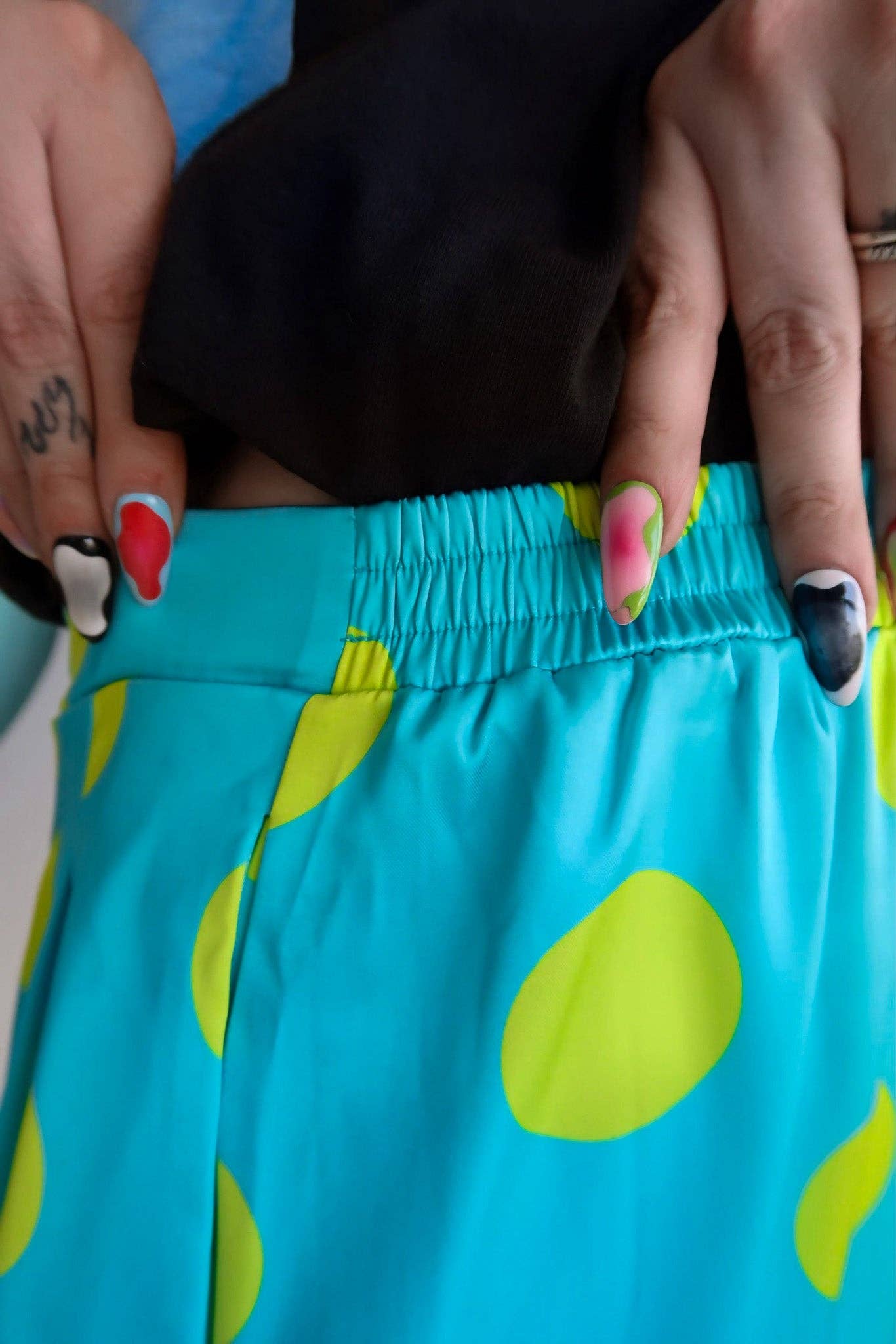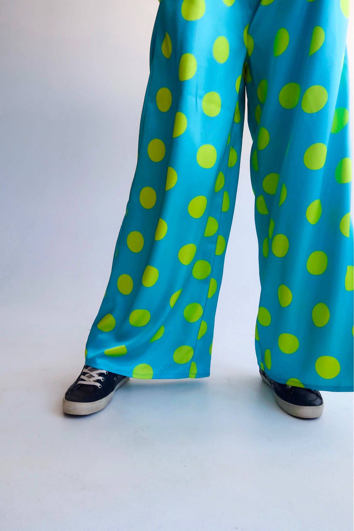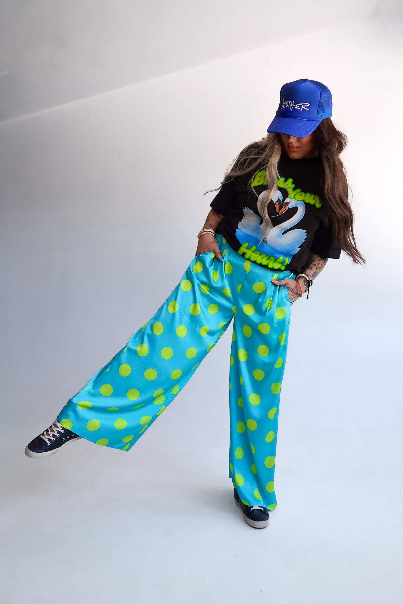 Main character moment, unlocked. The Spotlight Wide-Leg Satin Trousers mix a cobalt base with lime green polka dots for a look that’s playful but still luxe. The satin-like finish gives them that polished shine, while the wide-leg cut and elastic waistband keep them comfy enough to live in.