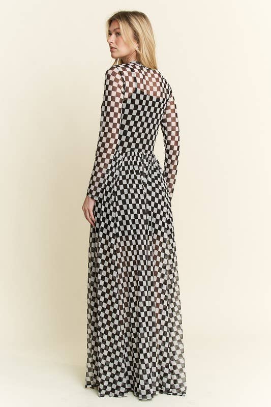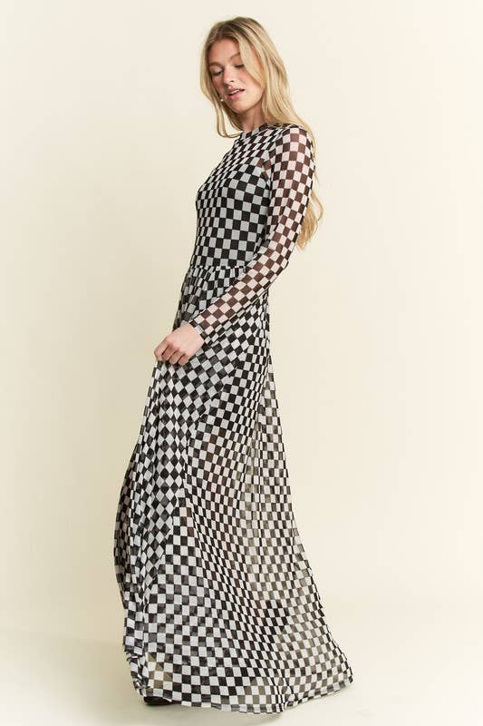 CHECKER PRINT MAXI DRESS -Maxi length -Soft and stretchy mesh knit fabric -Flowy and loose on the bottom -Lined with a Spaghetti Strap Short Dress -Mock Neckline --FABRIC 90% POLYESTER 10% SPANDEX LINING: 100% POLYESTER