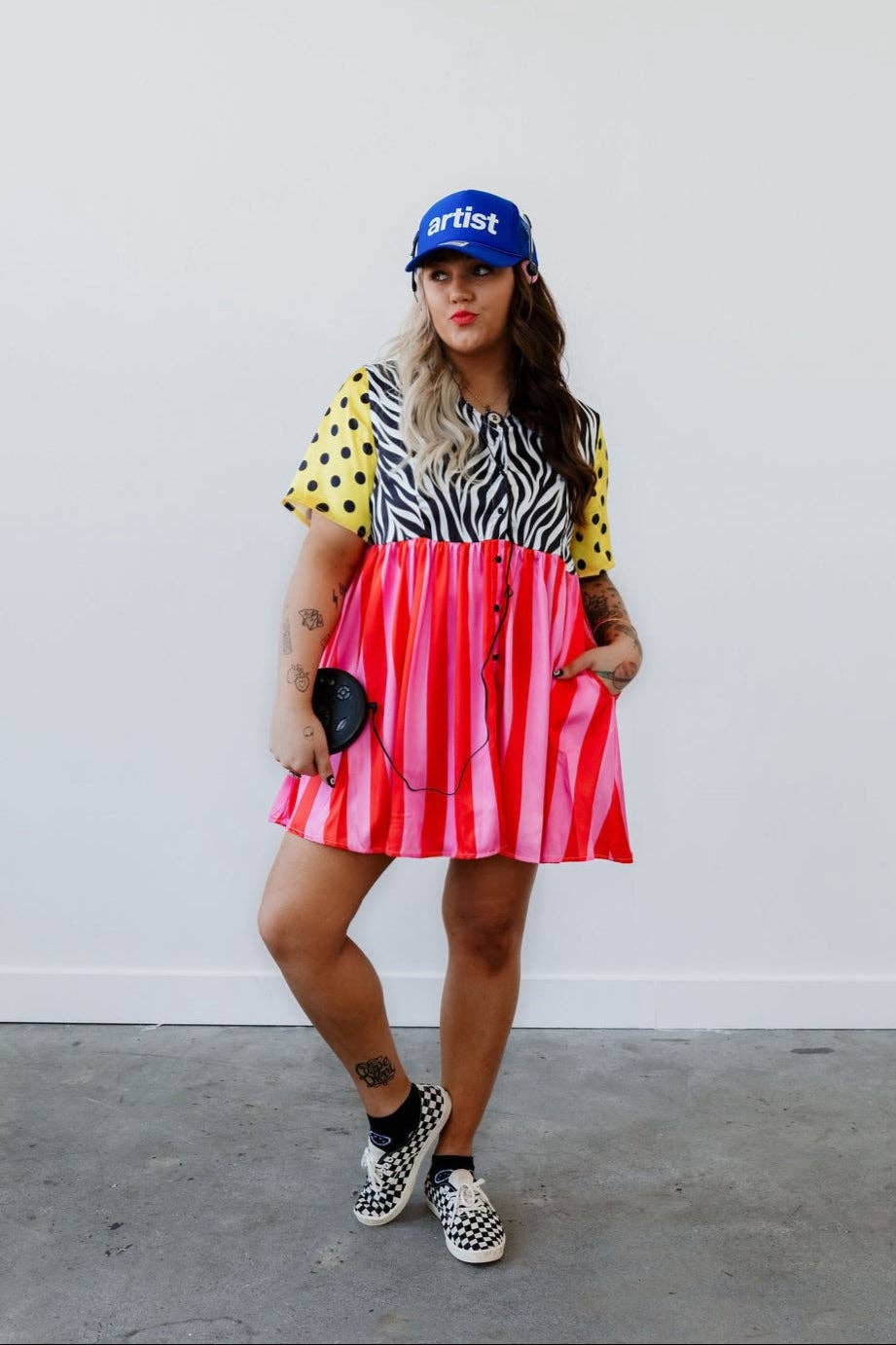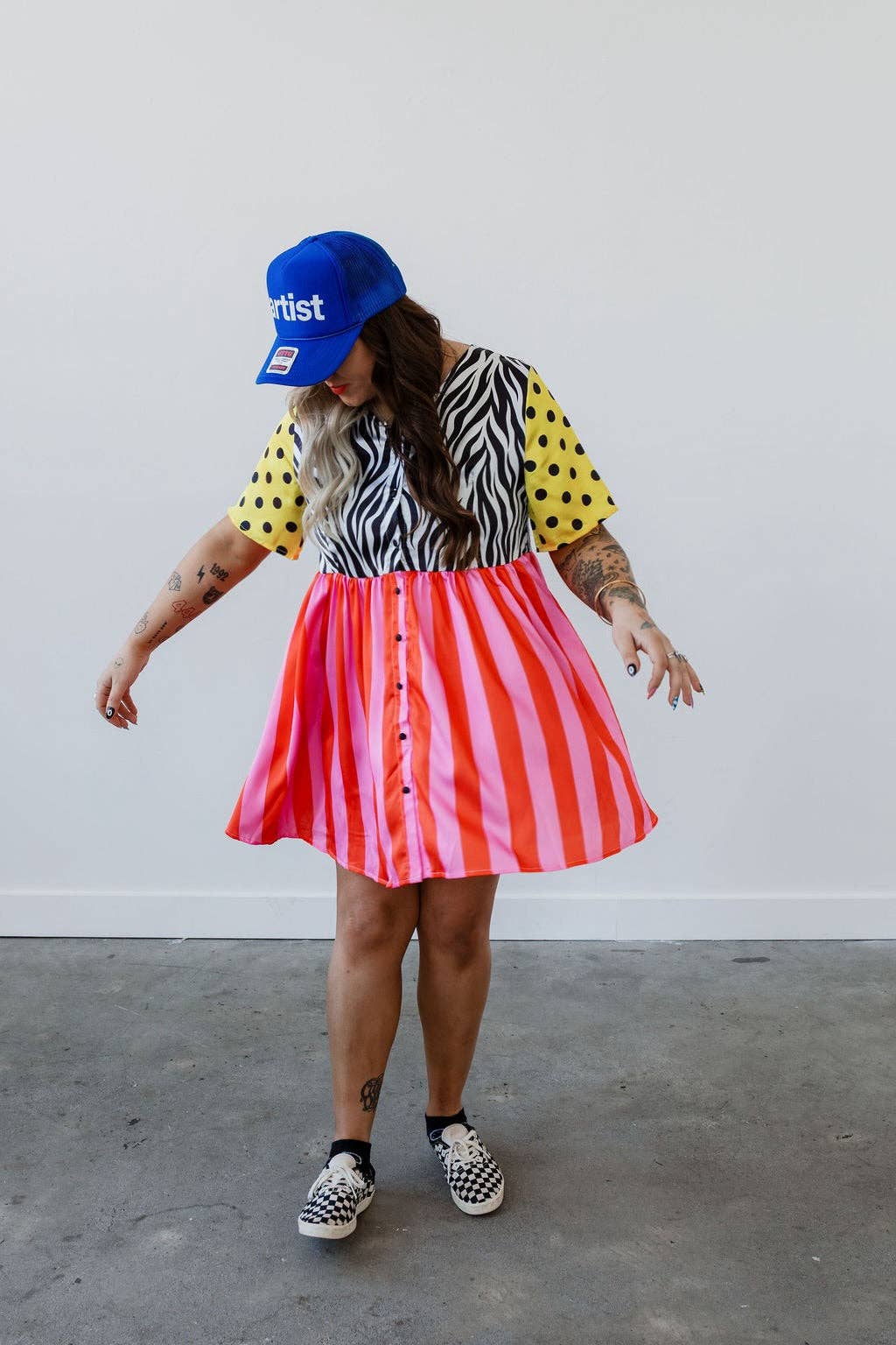 Unapologetically wild. The Eclectic Jungle Mini Dress is a statement maker with zero hesitation. Featuring a mix of stripes, polka dots, and zebra print, this button-up mini dress is built for standing out.