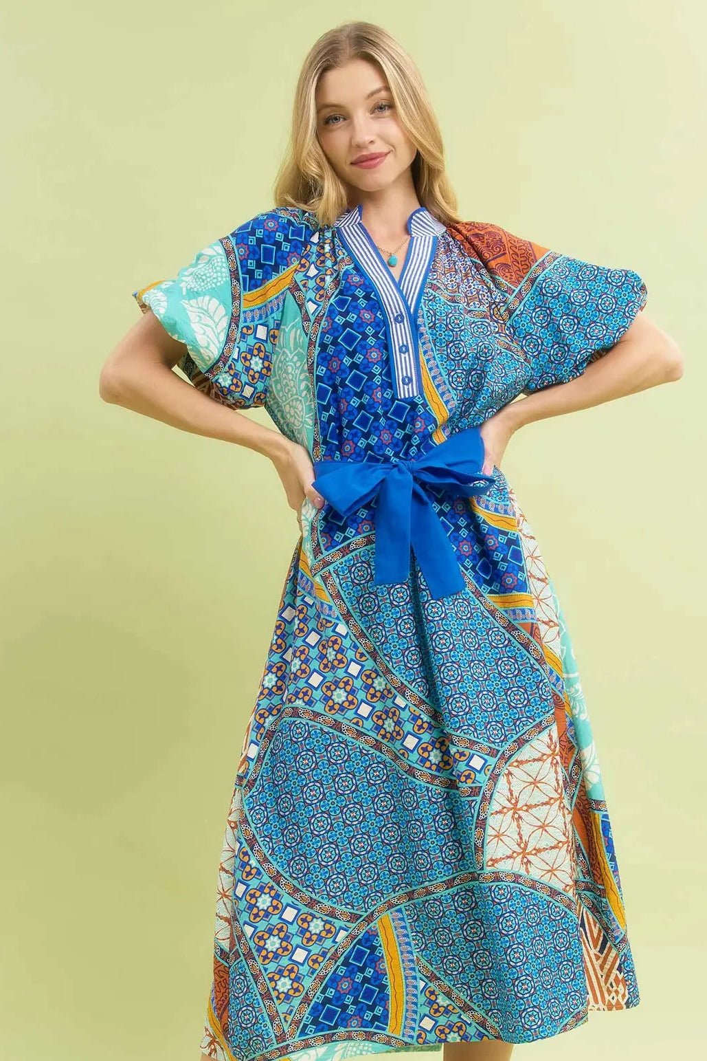 Embrace your inner free spirit in this charming blue mix patchwork print midi dress! Featuring a flattering tie waist that lets you customize your silhouette, this playful piece combines eclectic prints for a look that's totally unique. Perfect for weekend adventures, casual brunches, or whenever you want to add a pop of personality to your wardrobe. The midi length offers effortless elegance while the patchwork design ensures you'll stand out from the crowd. Mix, match, and make it yours!