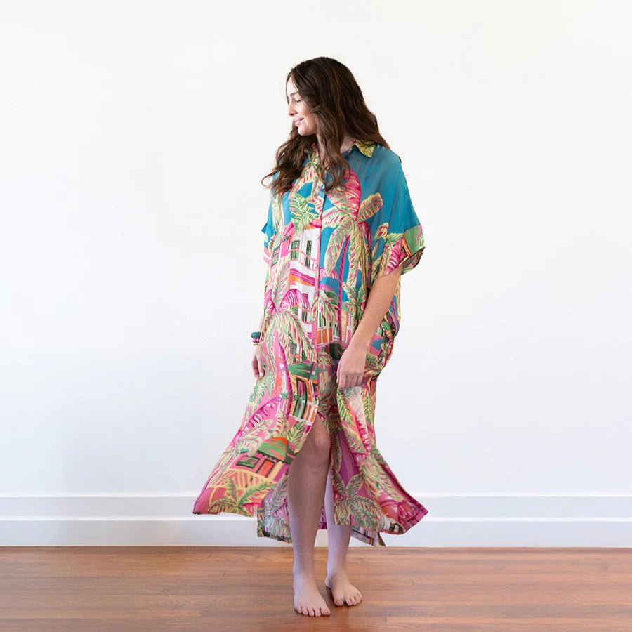 Our Winton and Waits button down dress is the epitome of effortless style. Crafted from lightweight, breathable 100% Modal Satin fabric, this dress drapes beautifully, offering both comfort and style. With its flattering silhouette, side slits, and graceful movement, it's perfect for any occasion, from brunch dates to exotic vacations. The button-down detailing mixes with the elevated prints to provide both timelessness and an of-the-moment look. Elevate your wardrobe with this versatile piece that can be styled in so many ways. Layer it, belt it, style it over leggings or jeans, or simply let it flow. Mix with a variety of shoes and accessories to suit any occasion.