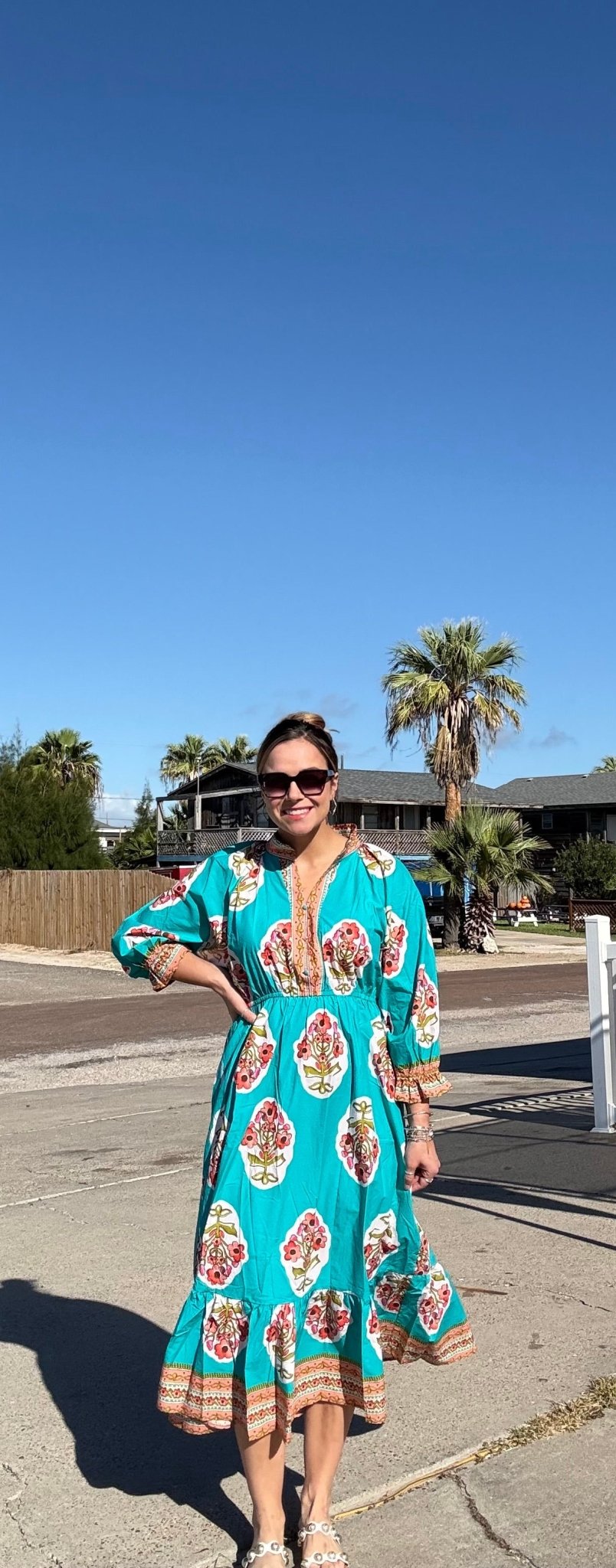 Twirl into spring with this charming aqua mint midi dress that's as fun as it is flattering. Featuring an eye-catching flower patch border print, a playful split neckline with ruffled stand collar, and delicate ruffled accents on the sleeves and hem, this dress brings effortless elegance to any occasion. The elastic waist ensures a comfortable fit all day long, while the lined skirt provides the perfect amount of coverage. Perfect for garden parties, brunch dates, or whenever you want to add a pop of color and personality to your wardrobe.
