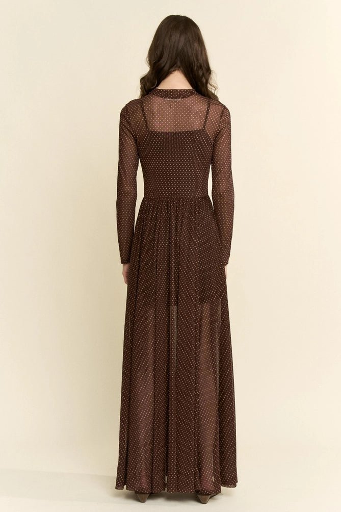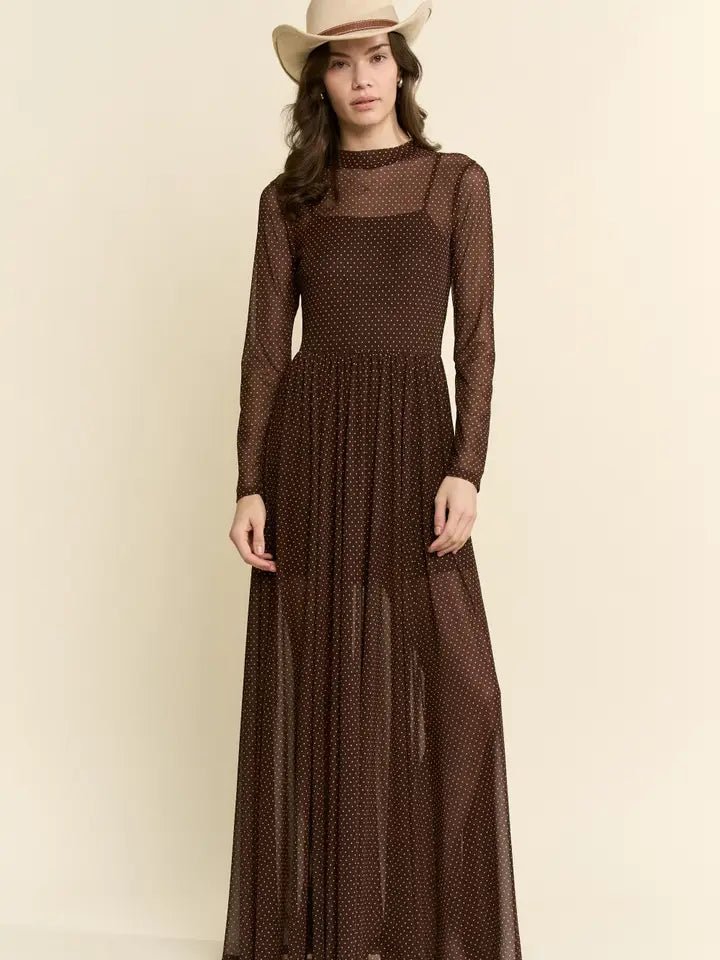 Elevate your wardrobe with this stunning polkadot print mesh maxi dress. The sheer mesh fabric creates an ethereal, romantic silhouette while the classic polkadot pattern adds playful charm. Perfect for evening events, garden parties, or sophisticated casual outings, this dress transitions seamlessly from day to night. The flowing maxi length offers graceful movement and timeless elegance. A versatile piece that pairs beautifully with heels, sandals, or statement jewelry for any occasion.