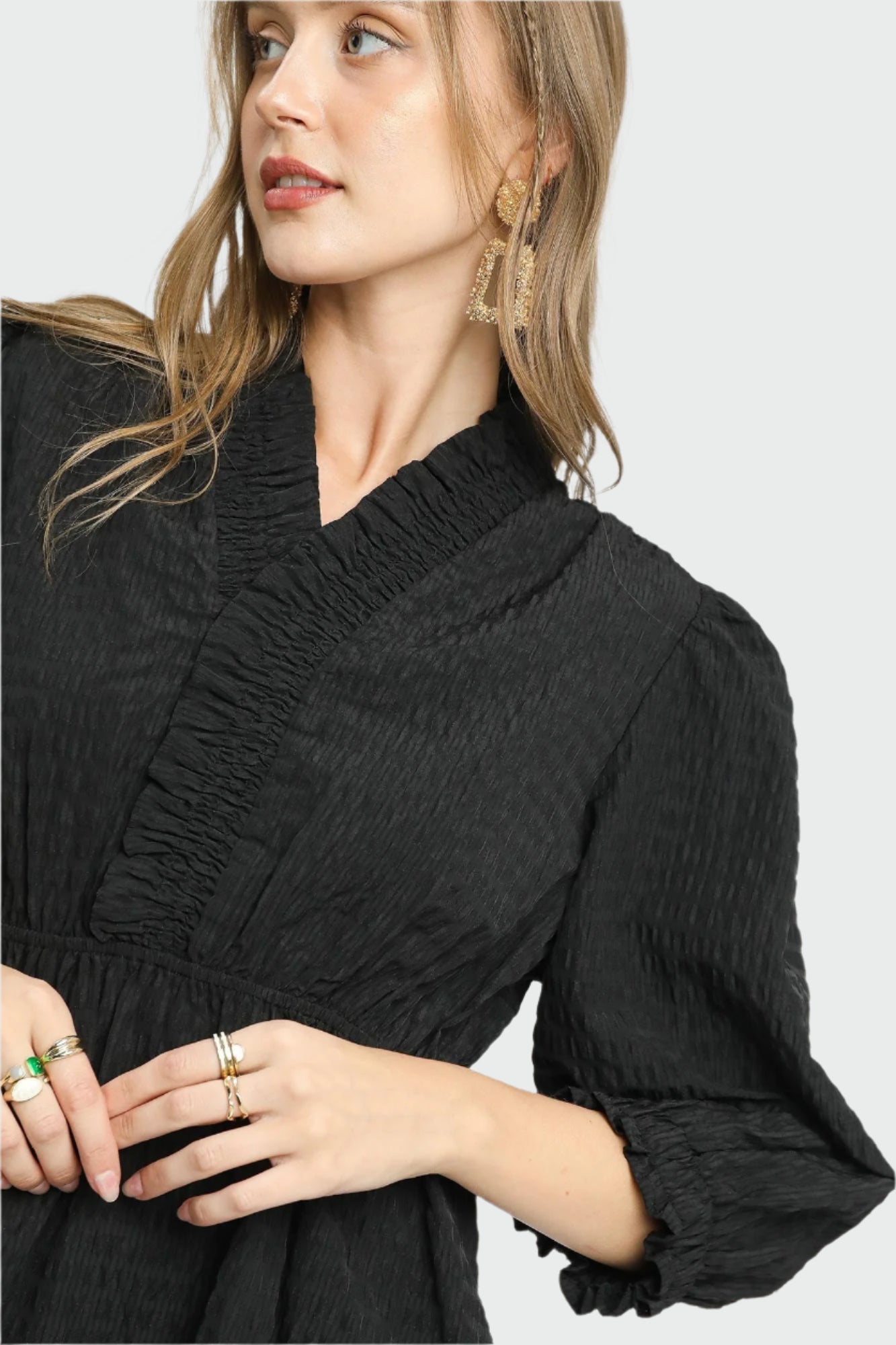 Step into effortless style with the Twilight Charm babydoll dress. Crafted from textured fabric, this playful piece features a flirty ruffle trim and smocked sleeves that add a touch of whimsy. The flattering V-neckline enhances your silhouette, while the lightweight, unlined design keeps you comfortable all day. Perfect for dancing through twilight or casual outings, this dress brings charm and ease to your wardrobe.