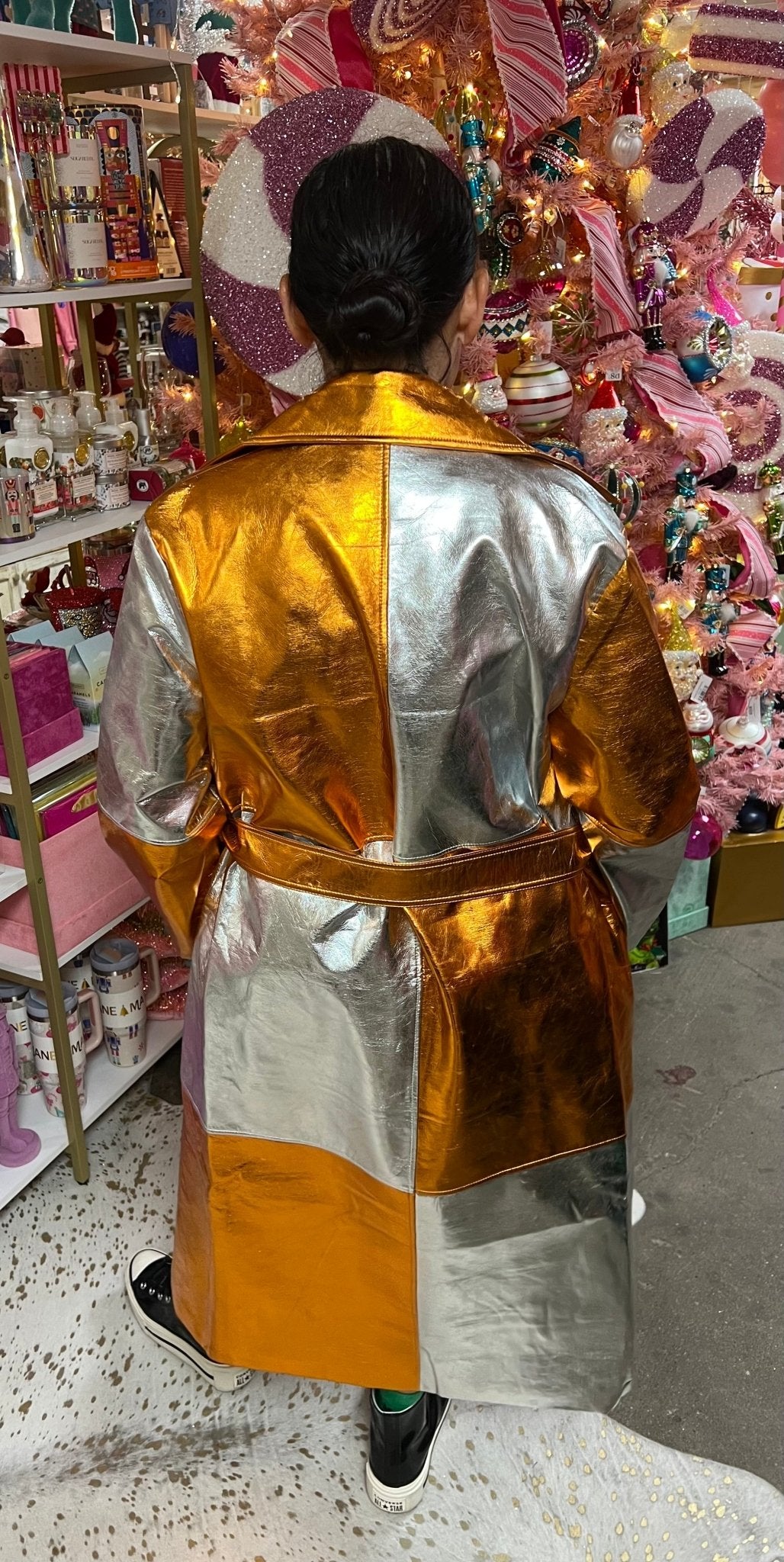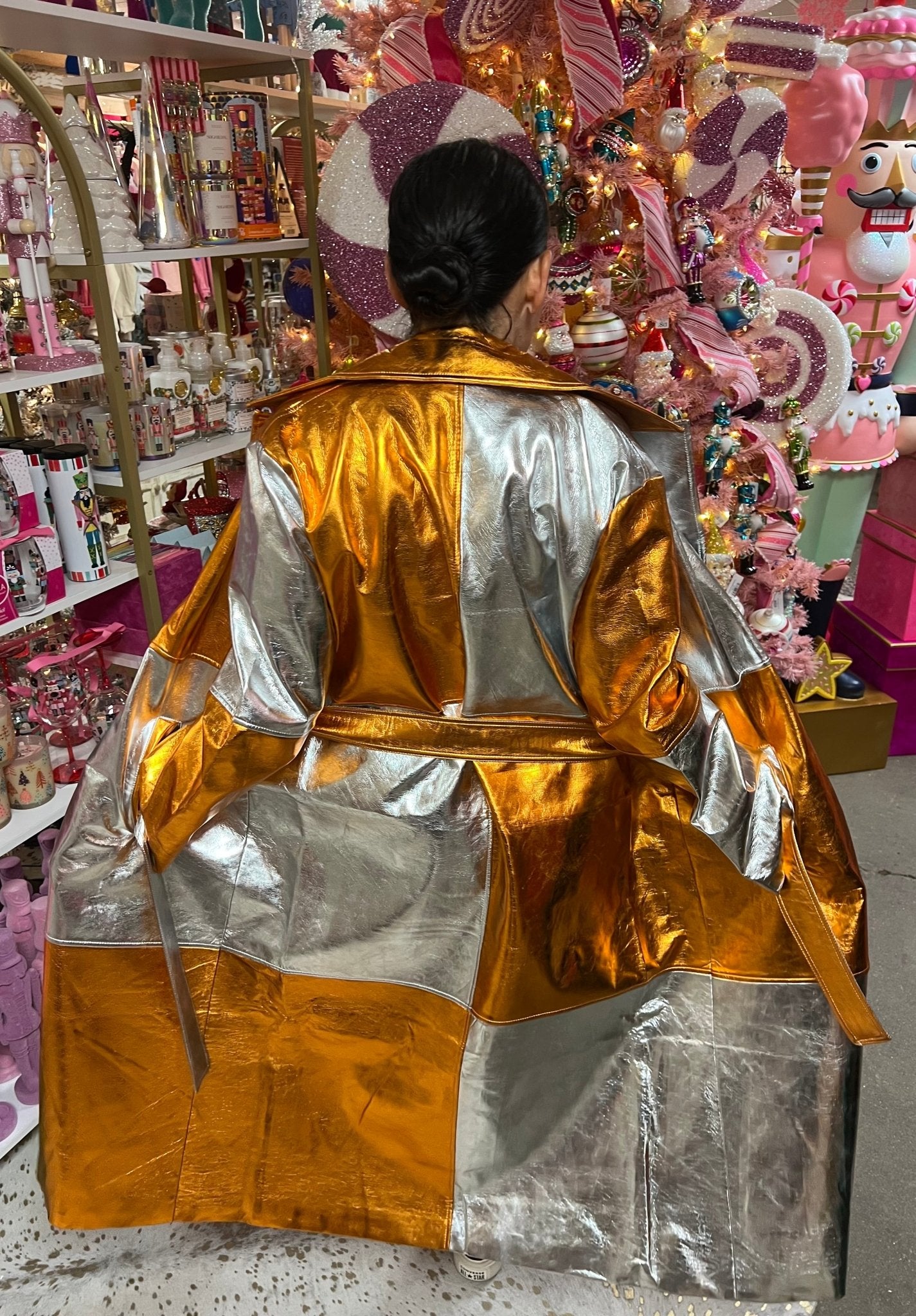 Step into Autumn and Winter with our stunning Metallic Eco Leather Trench Coat with our patchwork coat with belt fastening, notched lapels and two side pockets!