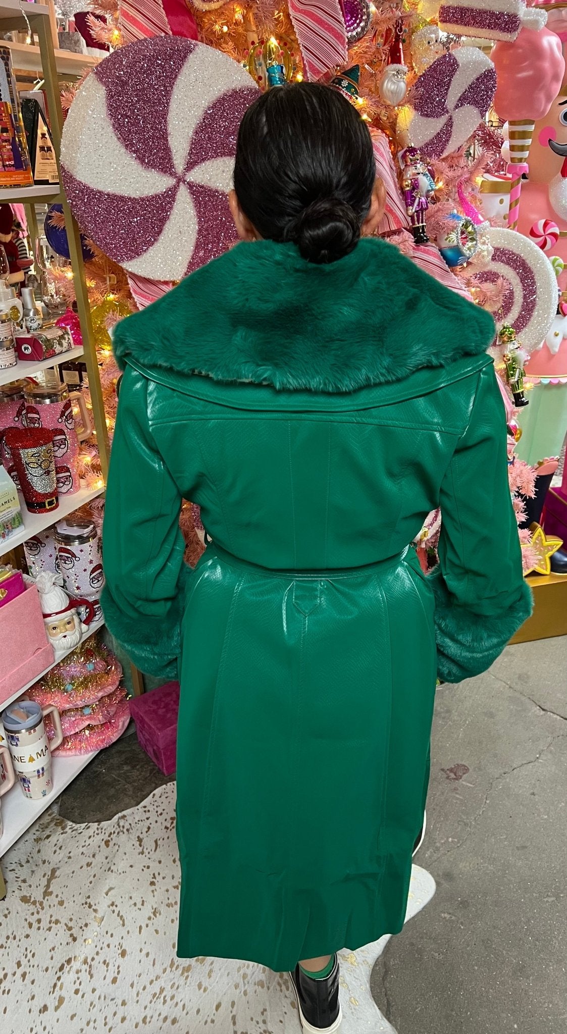 Super on-trend this green midi style trench coat will give you the vibes you need throughout the cooler weather. The brushed, soft, faux leather is embossed with a subtle embossed snake print and features a detachable faux fur collar and cuffs so you get two look for the price of one!