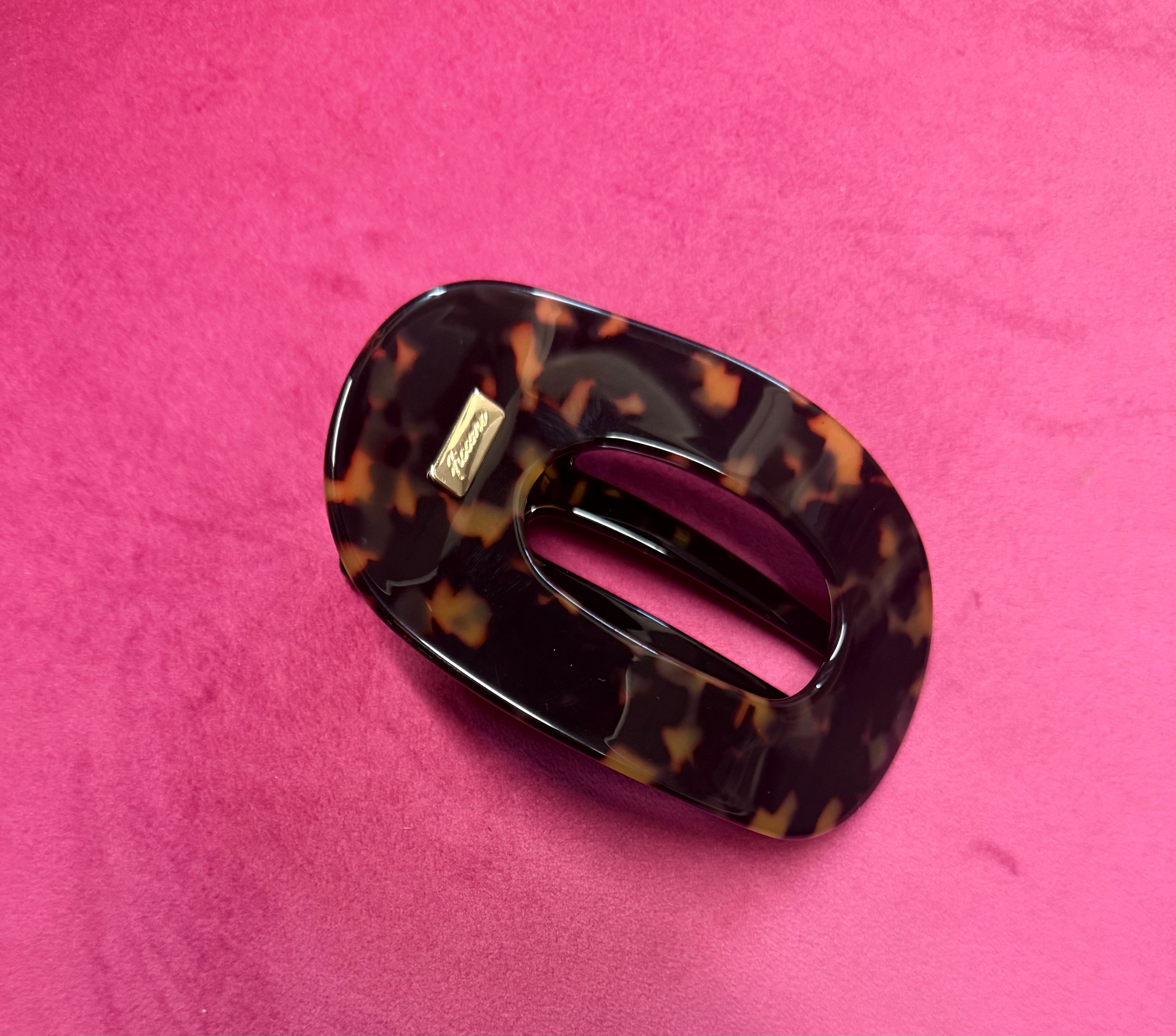 The Oval Yoga Hair Clip is your new stylish sidekick for effortless hair control. Crafted mostly from hand-made Italian acetate with a gleaming Ficcare plaque, it holds small to medium volume hair securely without any discomfort. Whether you're flowing through yoga poses or cruising in your car, this clip stays comfy and never pokes the back of your head. Add a touch of flair to any updo with this playful blend of function and fabulousness.