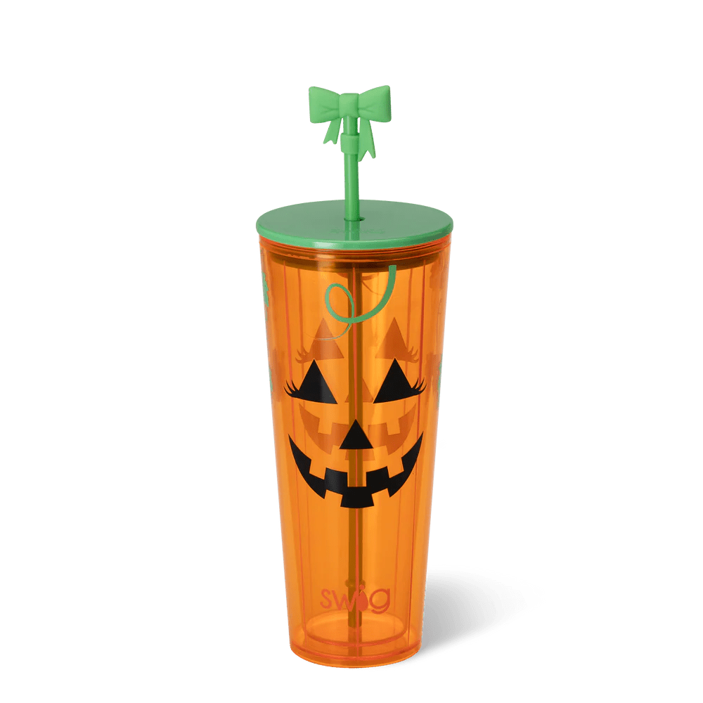 Perfect for whatever or wherever you drink! 🌟🥤 This pumpkin character comes to life with its fluttering eyelashes and curly vines on a glitter orange background.