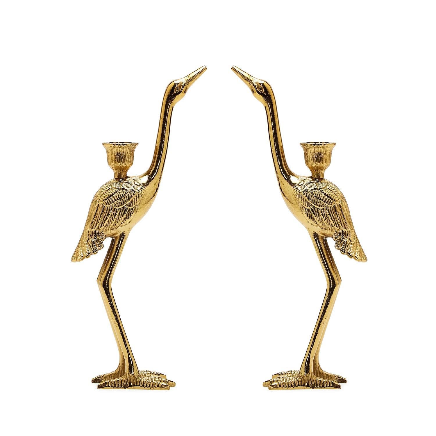 Bring the elegance of nature into your home with this crane made of cast aluminum hand-finished golden taper candle holders/sculptures. This crane shows off her graceful legs and elongated neck creating a graceful decorative accent and candle holder.