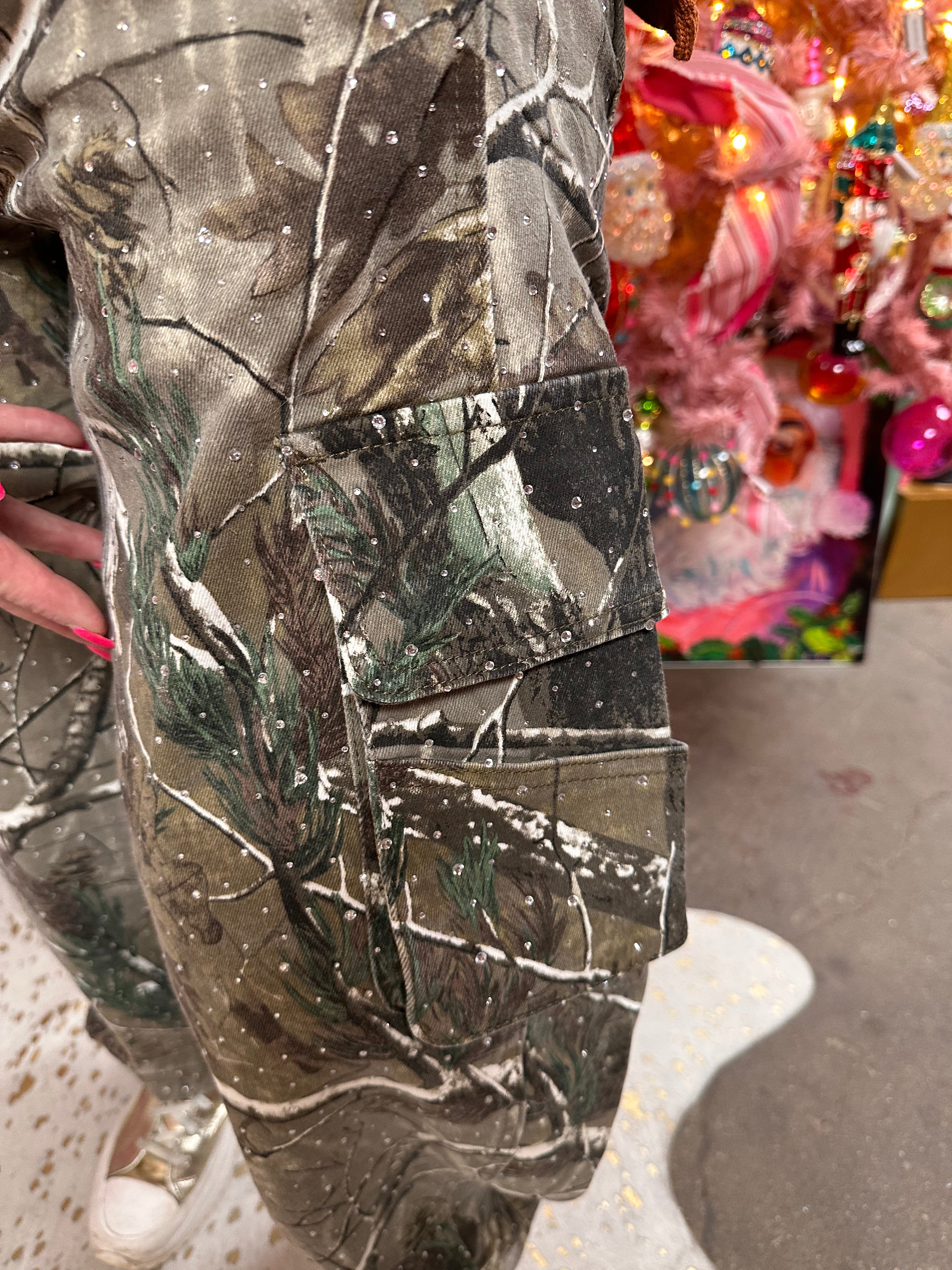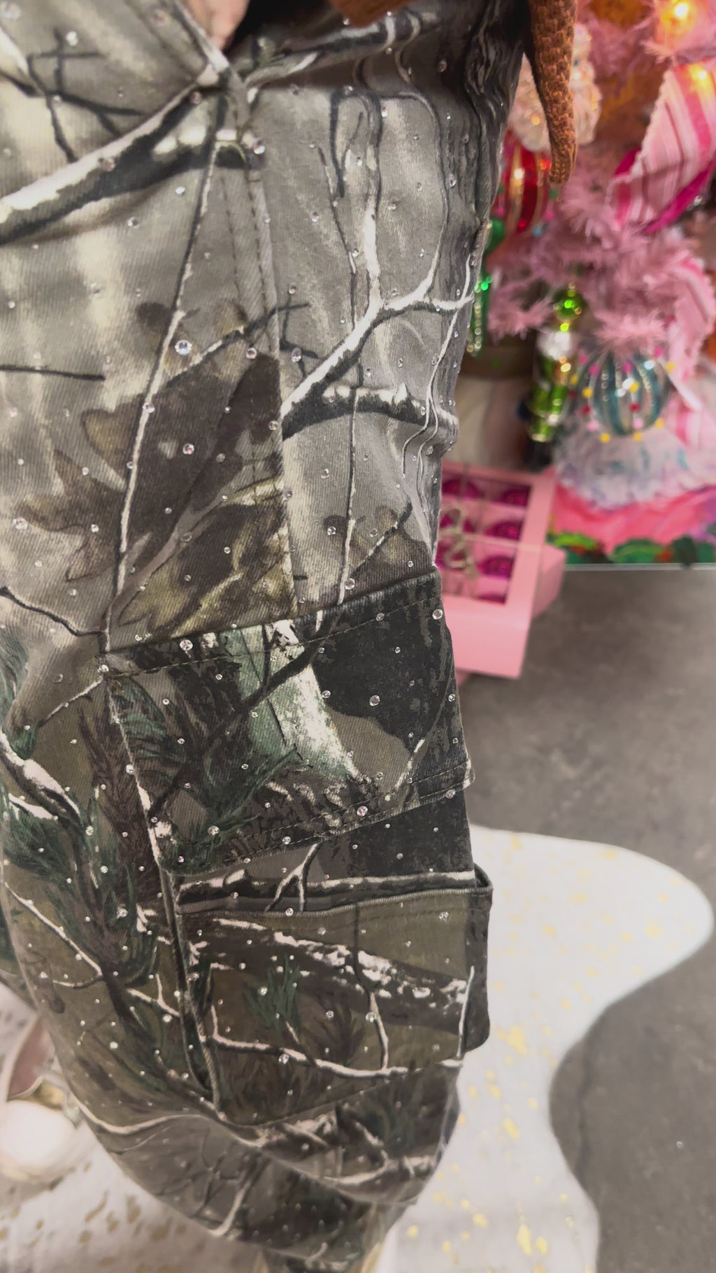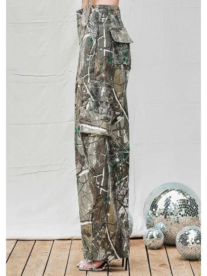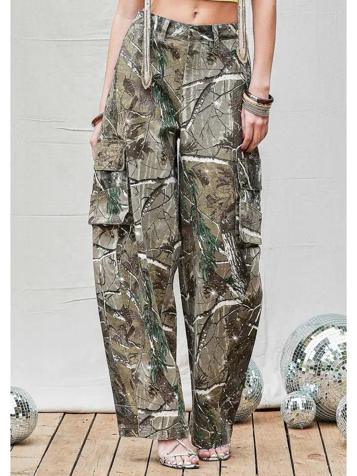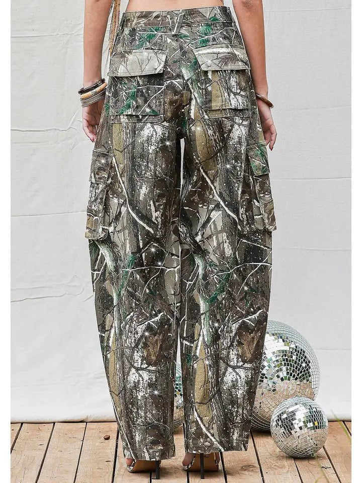 Blend in? Never heard of her. The Glamouflage Jeans bring all the edge of classic camo with a serious upgrade — rhinestone detailing that catches the light (and attention) from every angle. Designed in a baggy barrel-leg silhouette for that effortless streetwear vibe, these jeans serve both utility and drama in one standout piece.