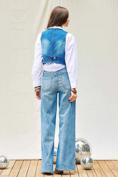 A pair of high-rise wideleg jeans featuring side pearl stud detail, a 5-Pocket construction and zip-fly closure.
