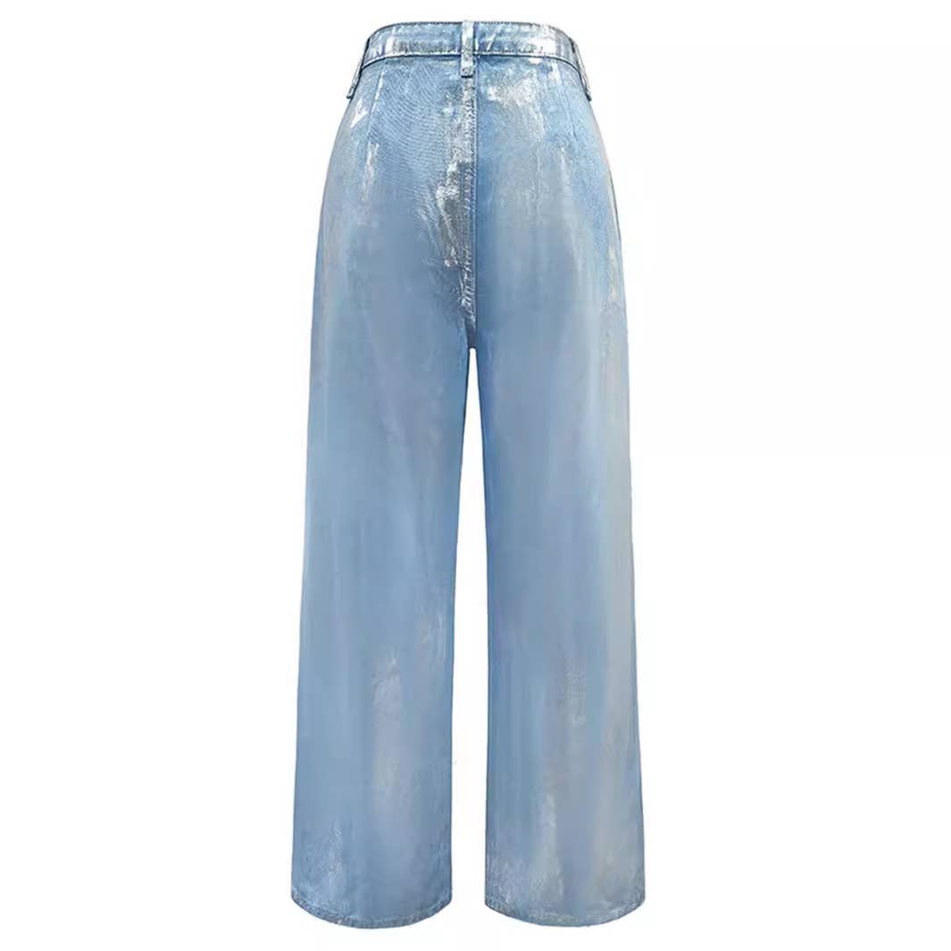 Step into the spotlight with these show-stopping wide-leg jeans that blend edgy glamour with everyday comfort. Featuring eye-catching metal brazing details that catch the light with every move, these jeans transform a basic silhouette into a statement piece. The relaxed wide-leg cut offers freedom of movement while the shiny embellishments add that perfect touch of party-ready pizzazz. Whether you're heading to a night out or want to elevate your casual look, these jeans deliver serious style without compromising on wearability.
