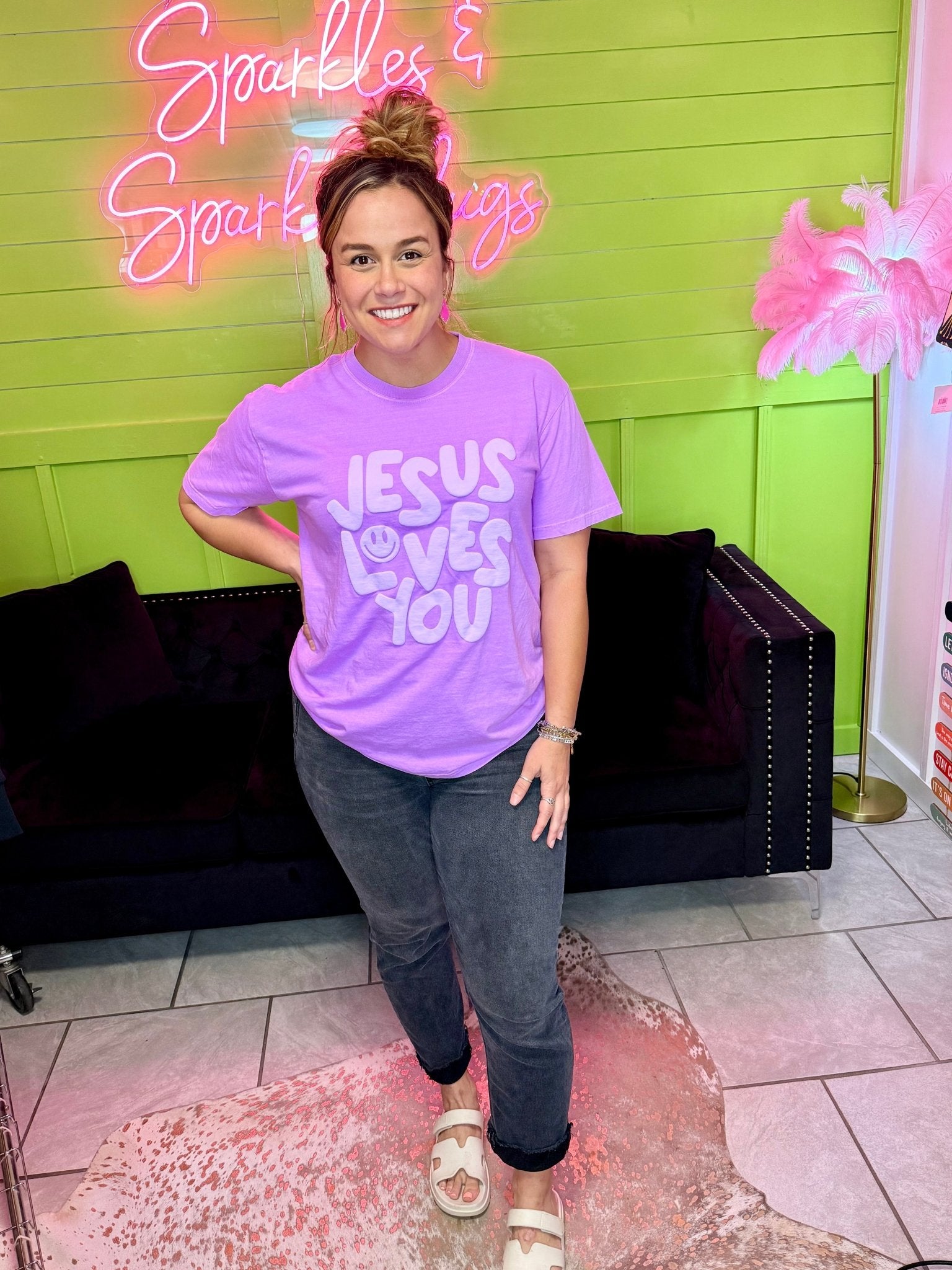 Brighten your day with this playful neon violet tee featuring a cheerful "JESUS LOVES YOU" message in puffy letters, accompanied by a smiling face. Soft and comfortable, it's perfect for spreading joy and positivity wherever you go.