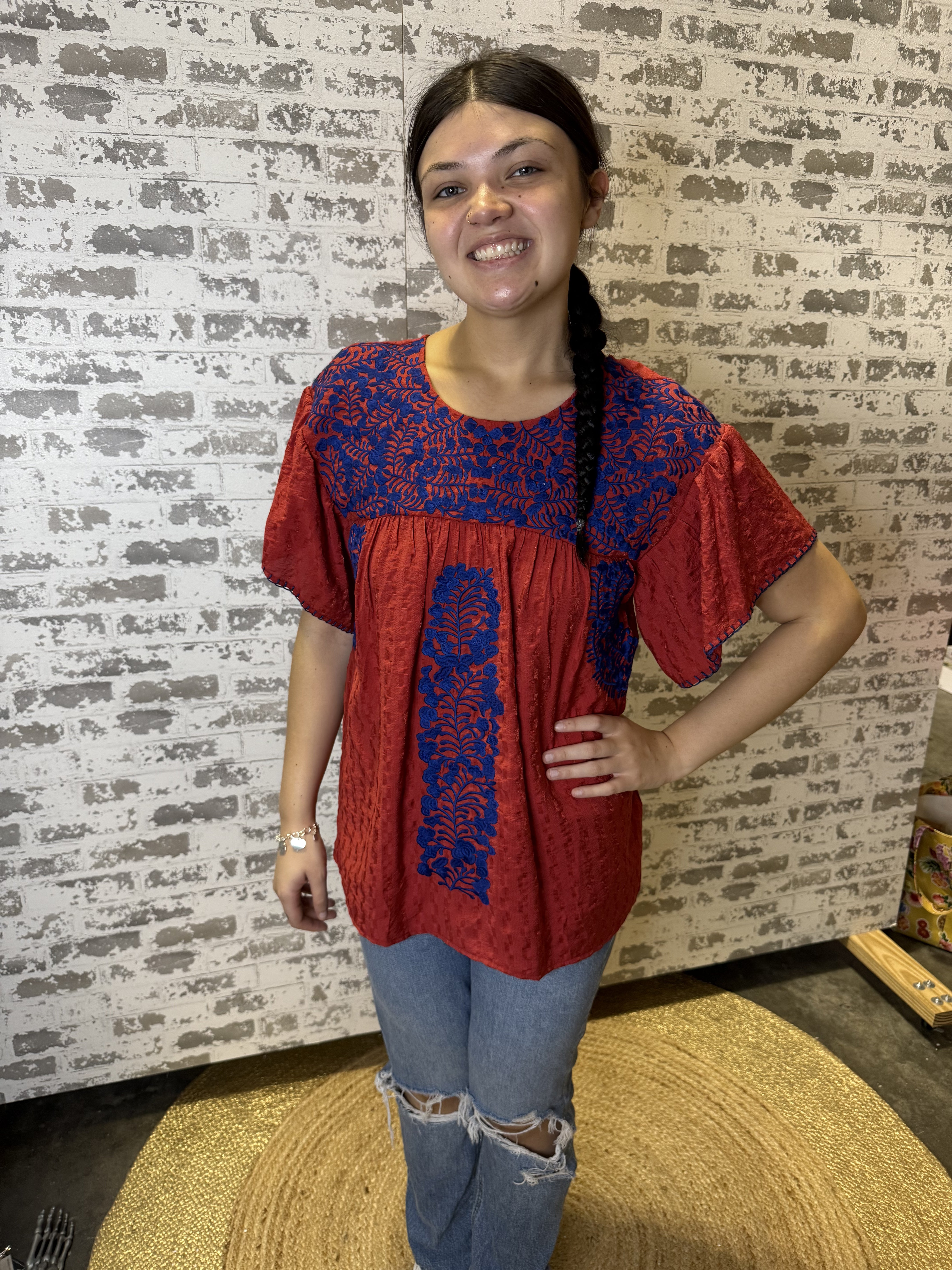 The Chelsea Top is a red top with blue embroidery. This red fabric has the prettiest textured shine that adds the cutest detail to this top! Pair with denim for a simple and fun 4th of July outfit!