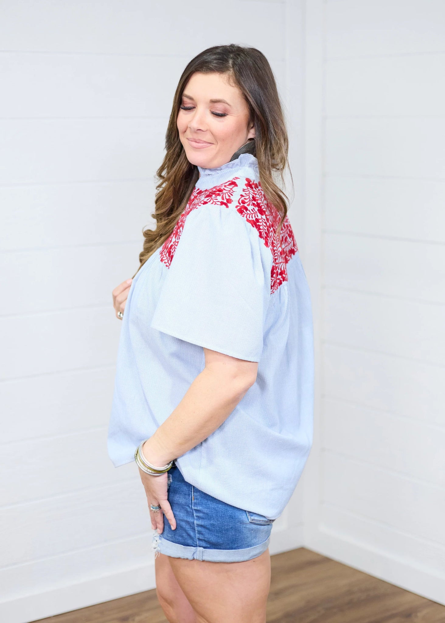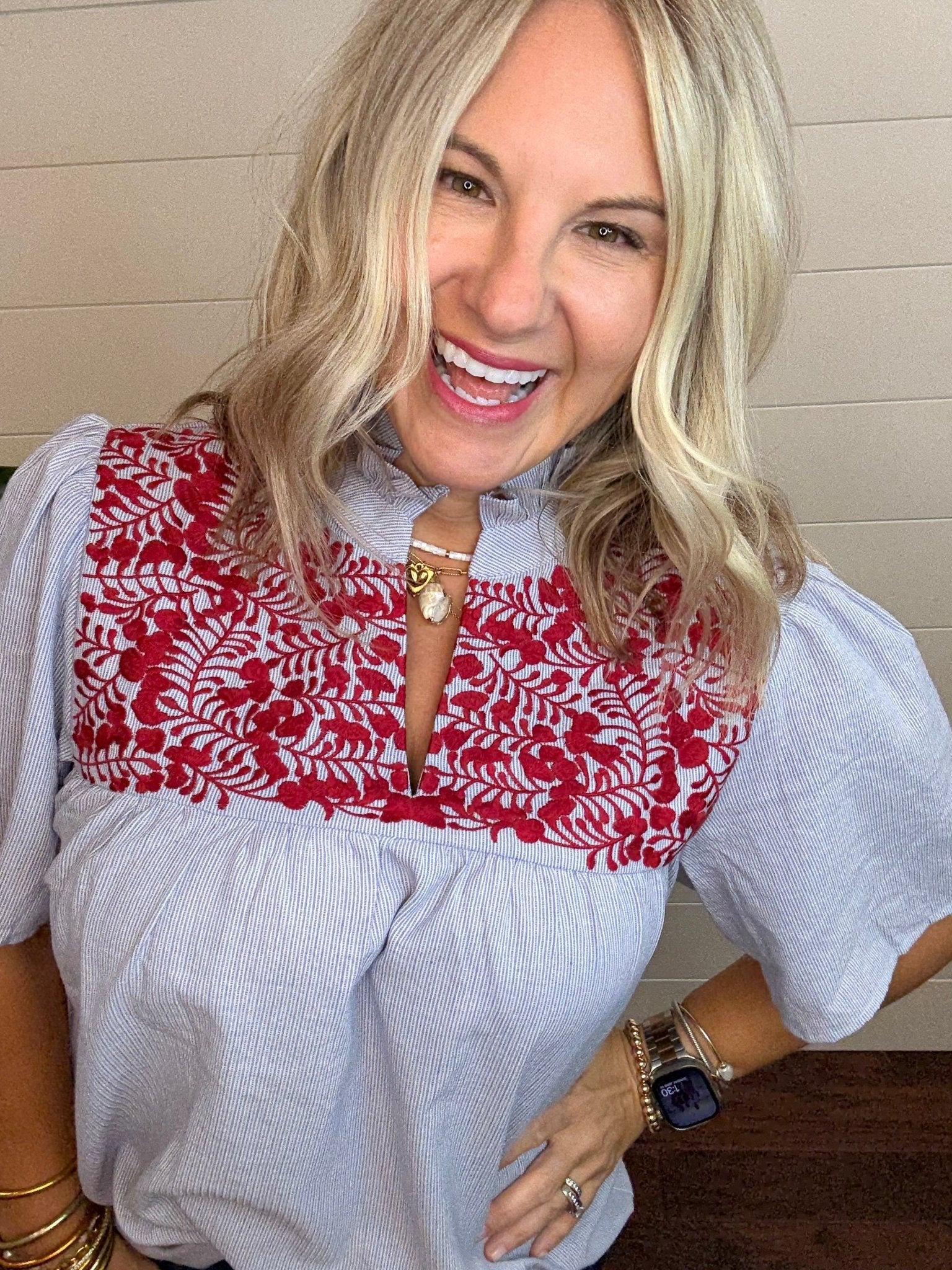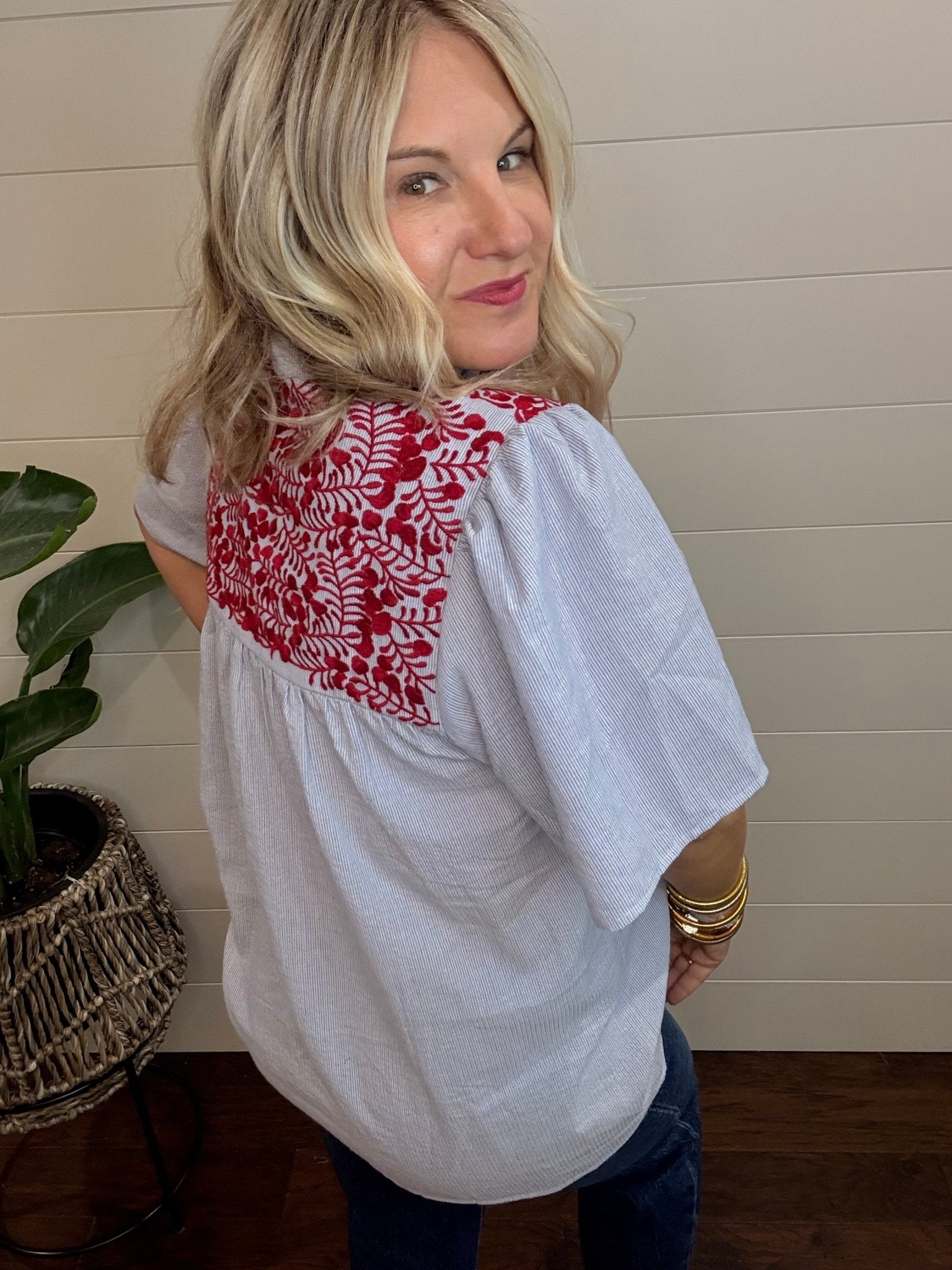 This Reece Top is a denim and white striped v-neck with red embroidery on the front and back. this top pairs perfect with white and denim bottoms. throw it on for your 4th of July BBQ! Bella model In a medium