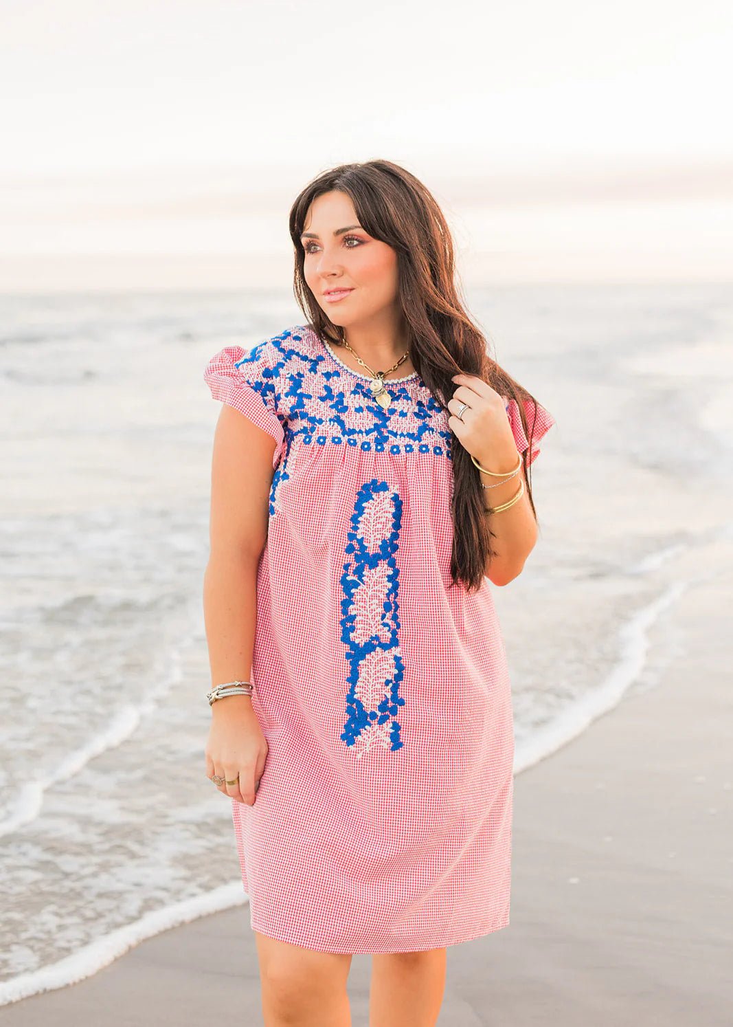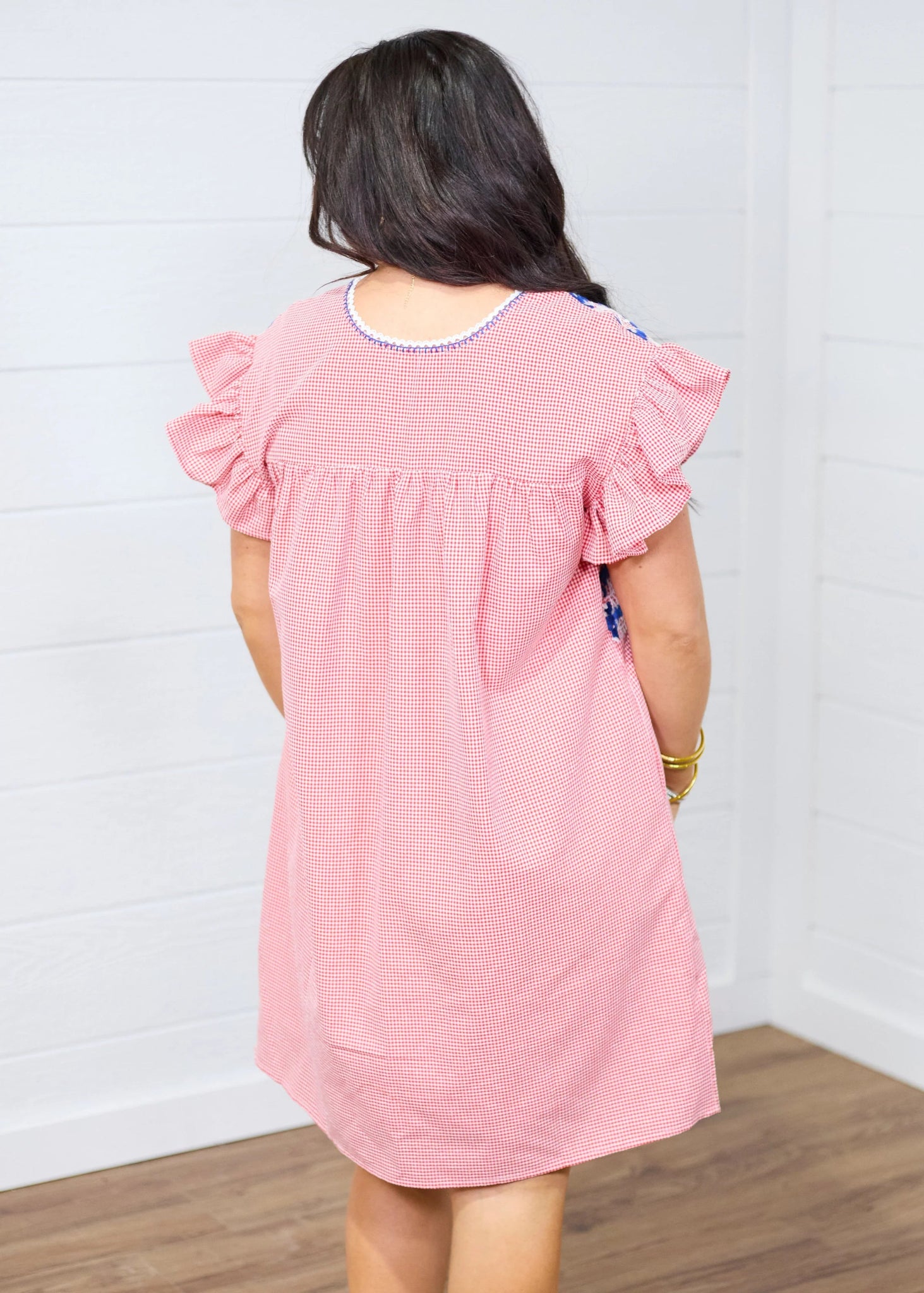 The Wren Dress is a red gingham dress with a ruffle sleeve and blue and white embroidery. This dress is so cute for 4th of July! Throw it on with sneakers or sandals to watch the 4th of July parade!