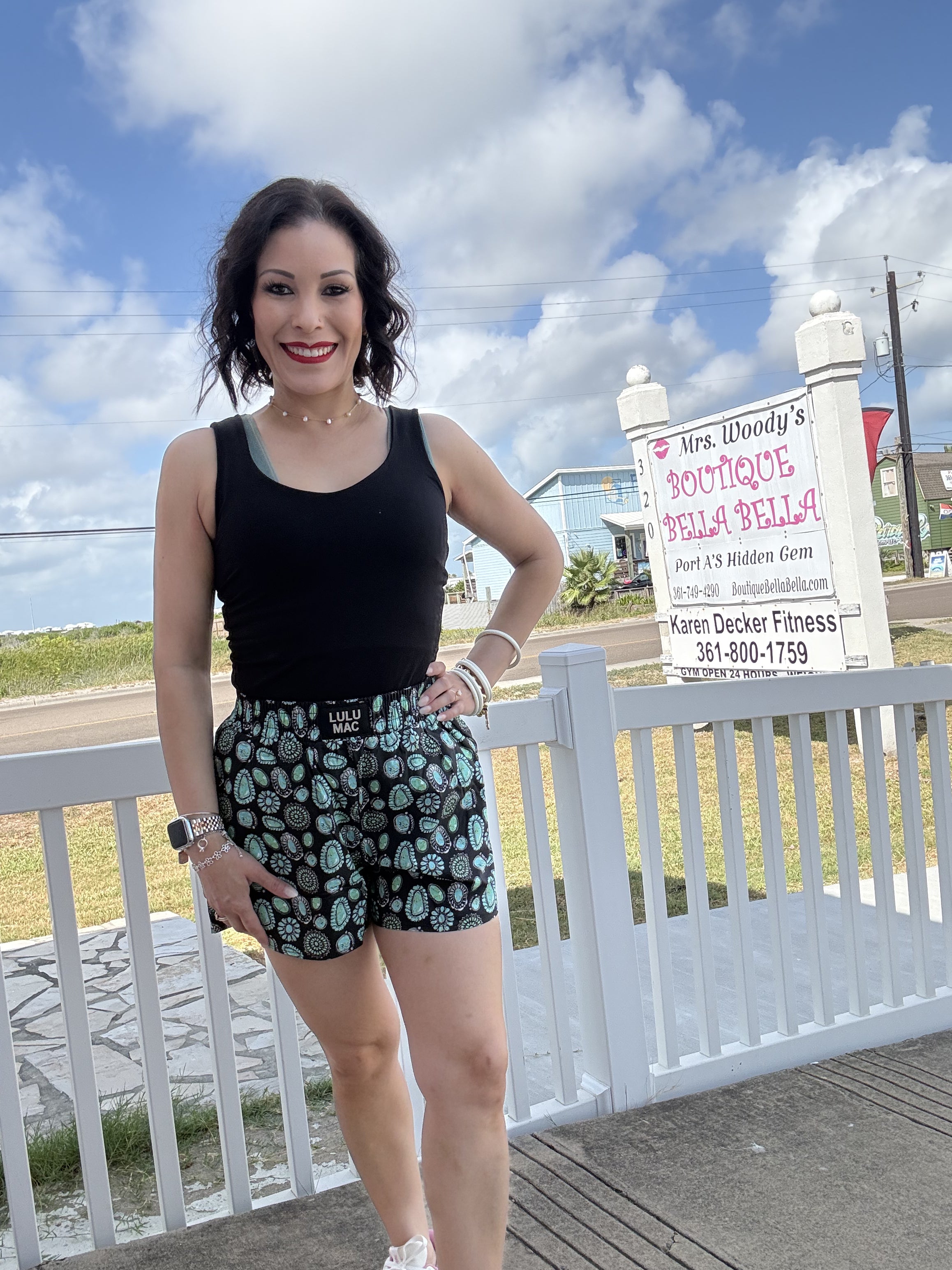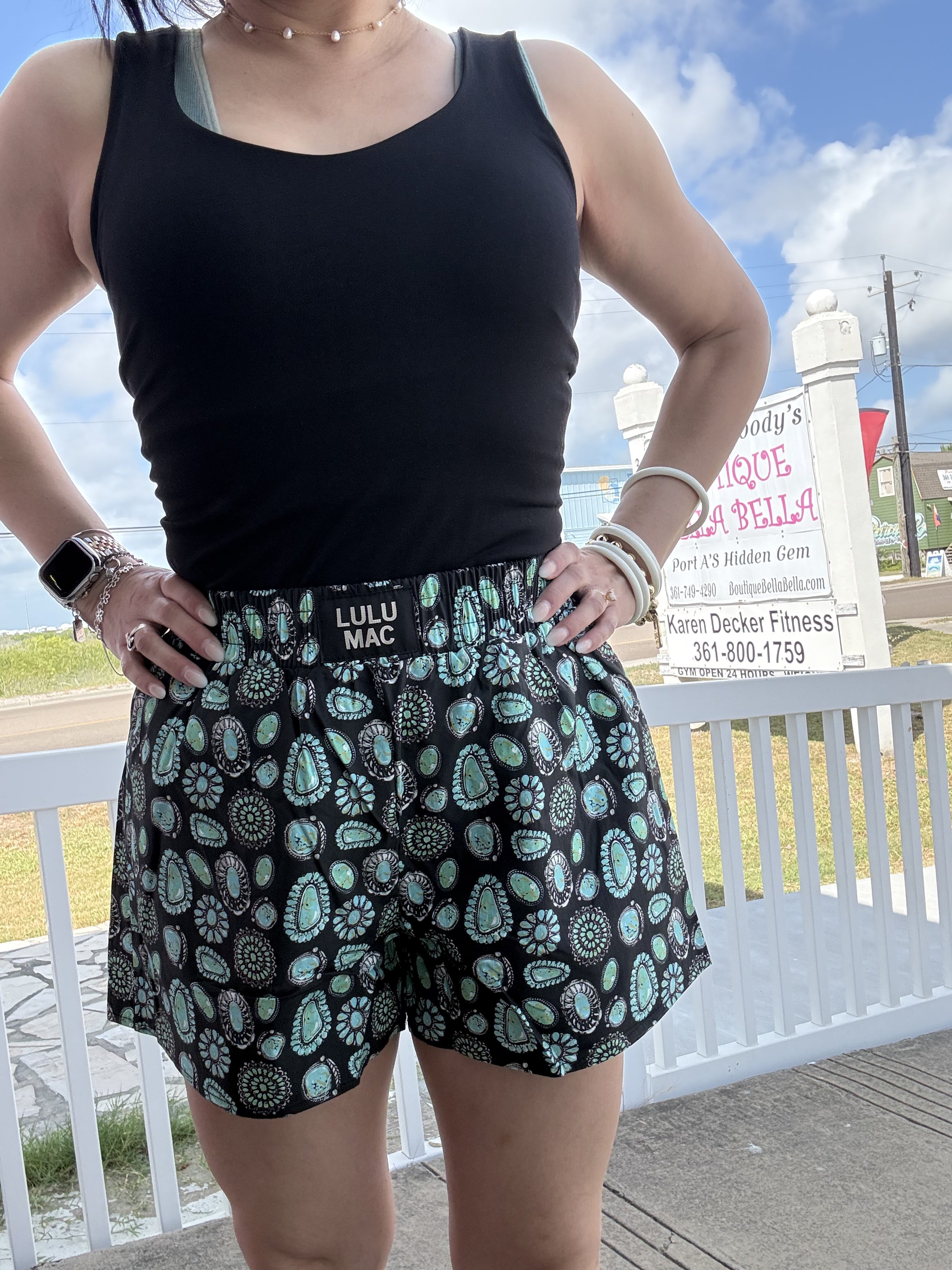 Slip into the Concho Boxer Shorts and enjoy lounging in style! Featuring a playful teal concho pattern on sleek black fabric, these shorts combine comfort and fun. With breathable softness, handy pockets, and a relaxed fit, they're made for living, lounging, and looking effortlessly cute every day.