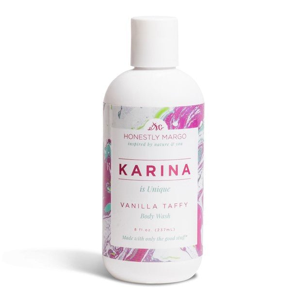 Indulge your body with our luxurious foaming, body wash in our Vanilla Taffy scent. It also doubles as a bubble bath when poured into the stream of water into the tub. Your skin will feel lustrous, radiant, and smooth. Our infusion of oils and botanicals will leave your body feeling clean and refreshed. KARINA is sugar and spice and oh so nice, with sugared berries, hints of green fig, lily of the valley, woody musk, and vanilla.