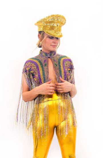 Make every moment a parade of style! This playful Beaded Fringe Capelet is inspired by festivals and second lines, perfect for Mardi Gras or any lively event. Featuring shimmering beaded fringe and intricate design in purple, green, and gold for an eye-catching statement piece that dances with you under the glowing float lights. Pair with a rhinestone conductor hat for a chic look fit for a Grand Marshall.
