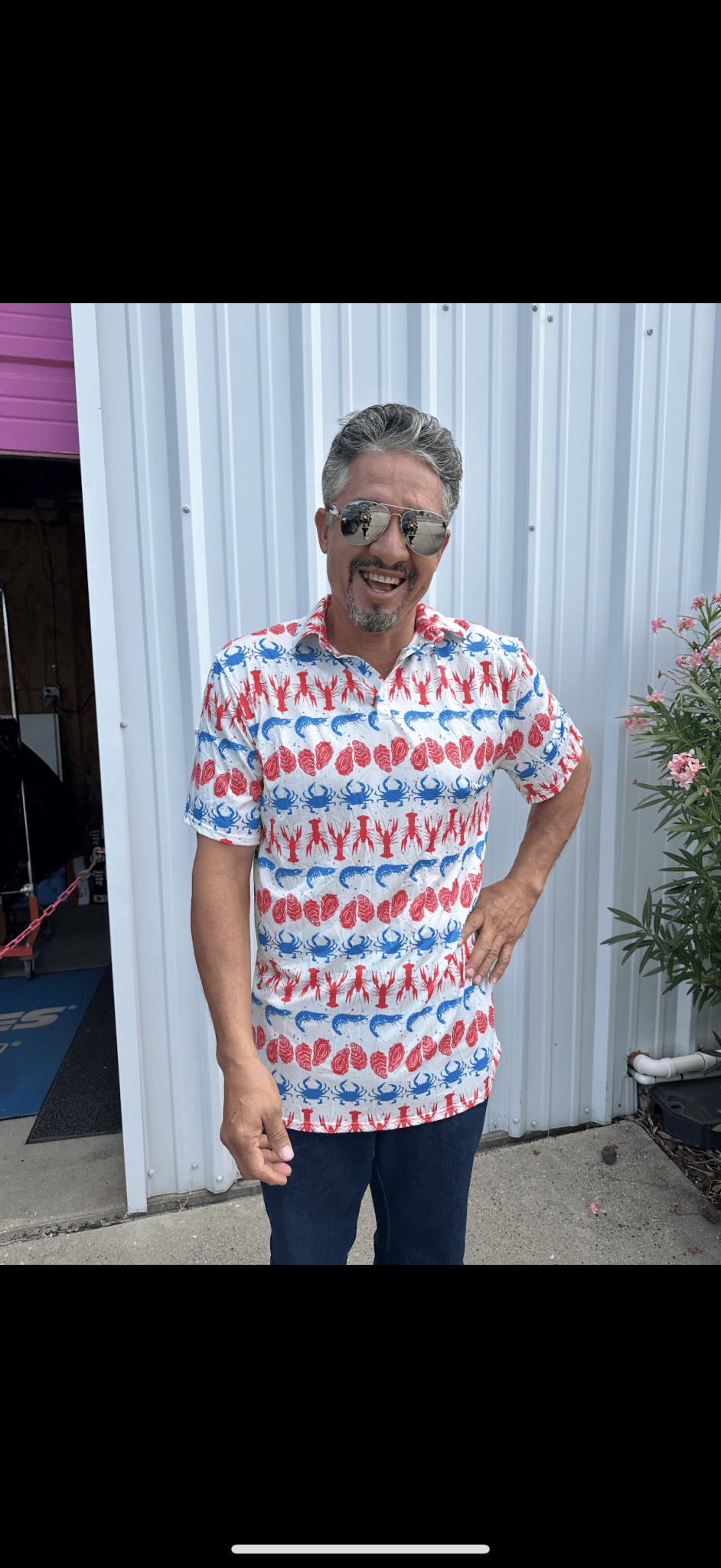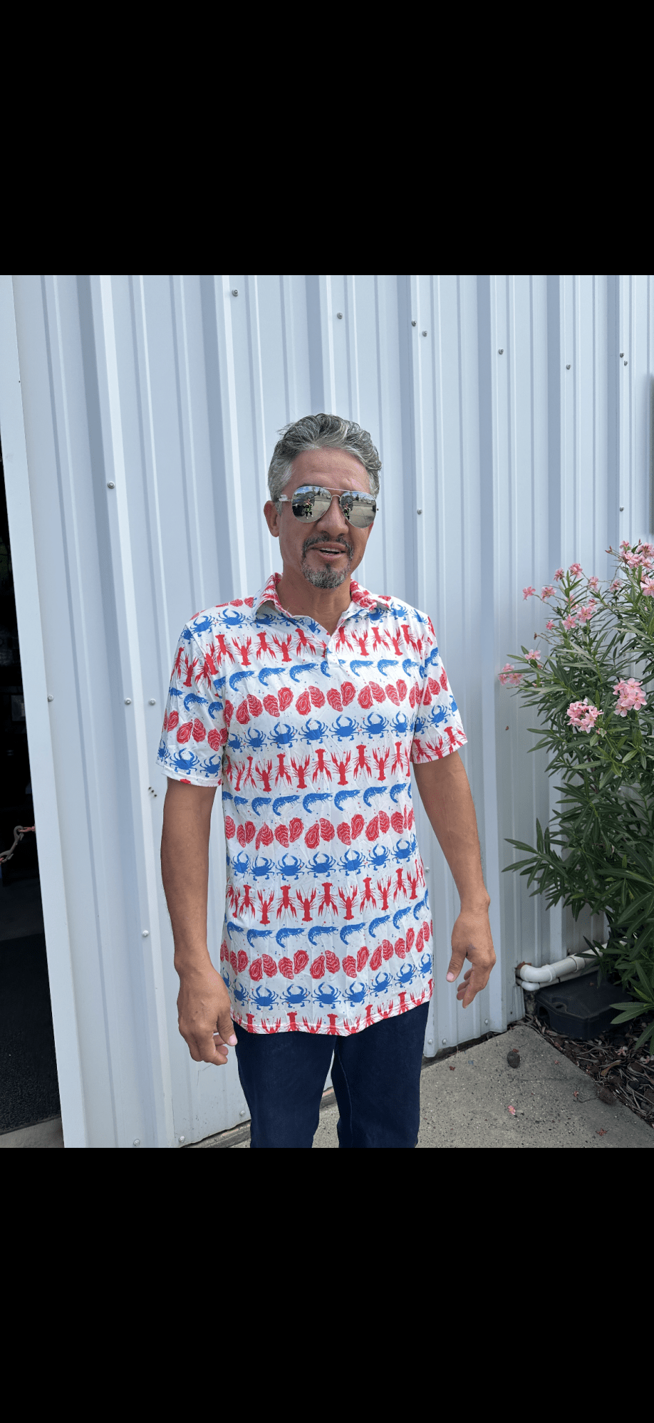 Dive into style with this Patriotic Seafood Men's Polo! Crafted from 3rd generation fabric, it keeps you cool and comfy while showing off your love for all things ocean. Perfect for casual outings or seafood festivals, this playful polo brings a splash of fun and freshness to your wardrobe. Celebrate summer vibes and seafood cravings in one unique, easy-to-wear shirt.