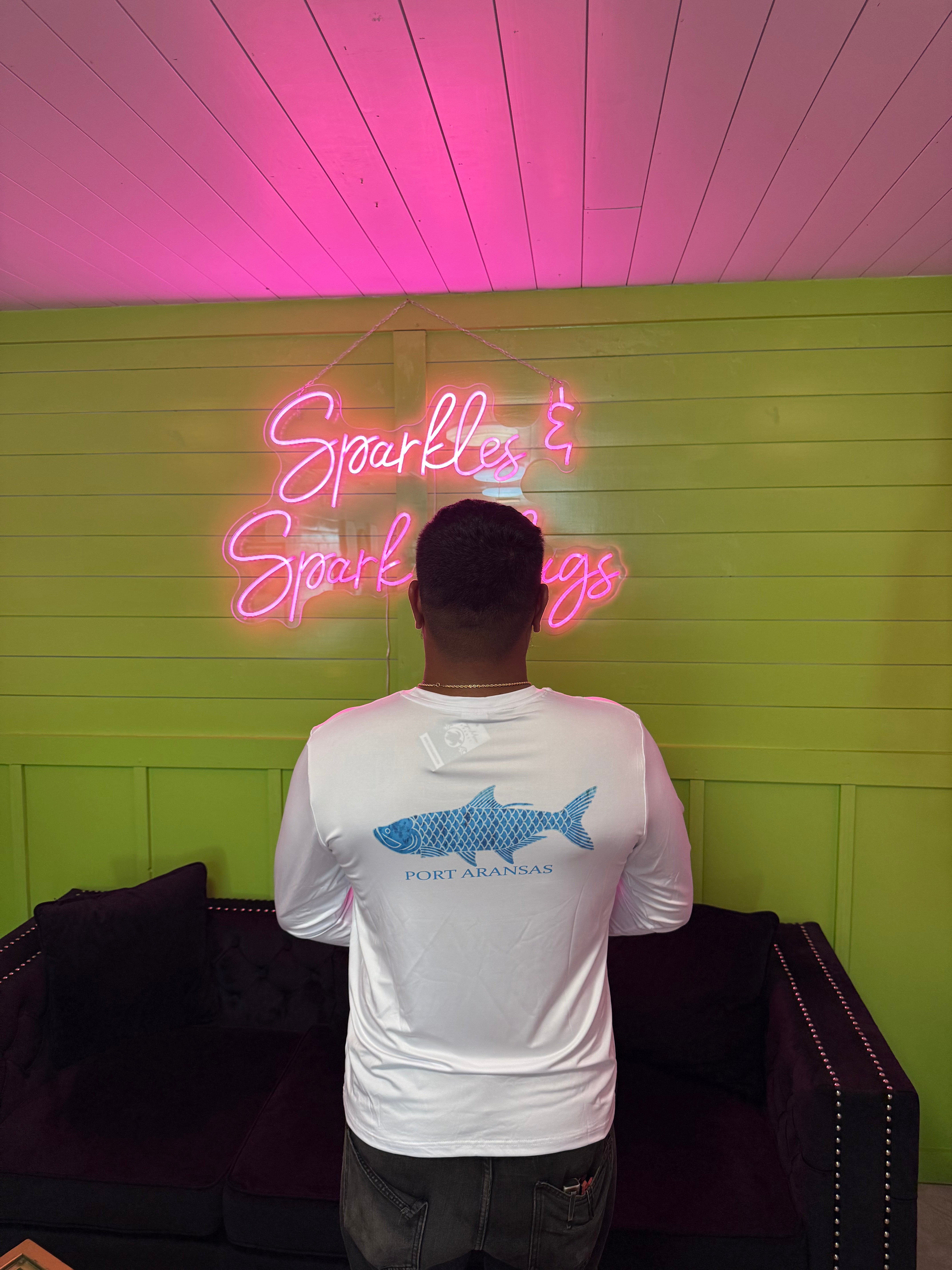 Stay cool and stylish in this Dry Fit unisex long sleeve shirt, featuring a lively blue tarpon on both front and back. The playful design proudly showcases "Port Aransas" beneath the tarpon, perfect for fishing enthusiasts and coastal lovers alike. Lightweight and breathable, it’s your go-to for sunny days and casual outings.