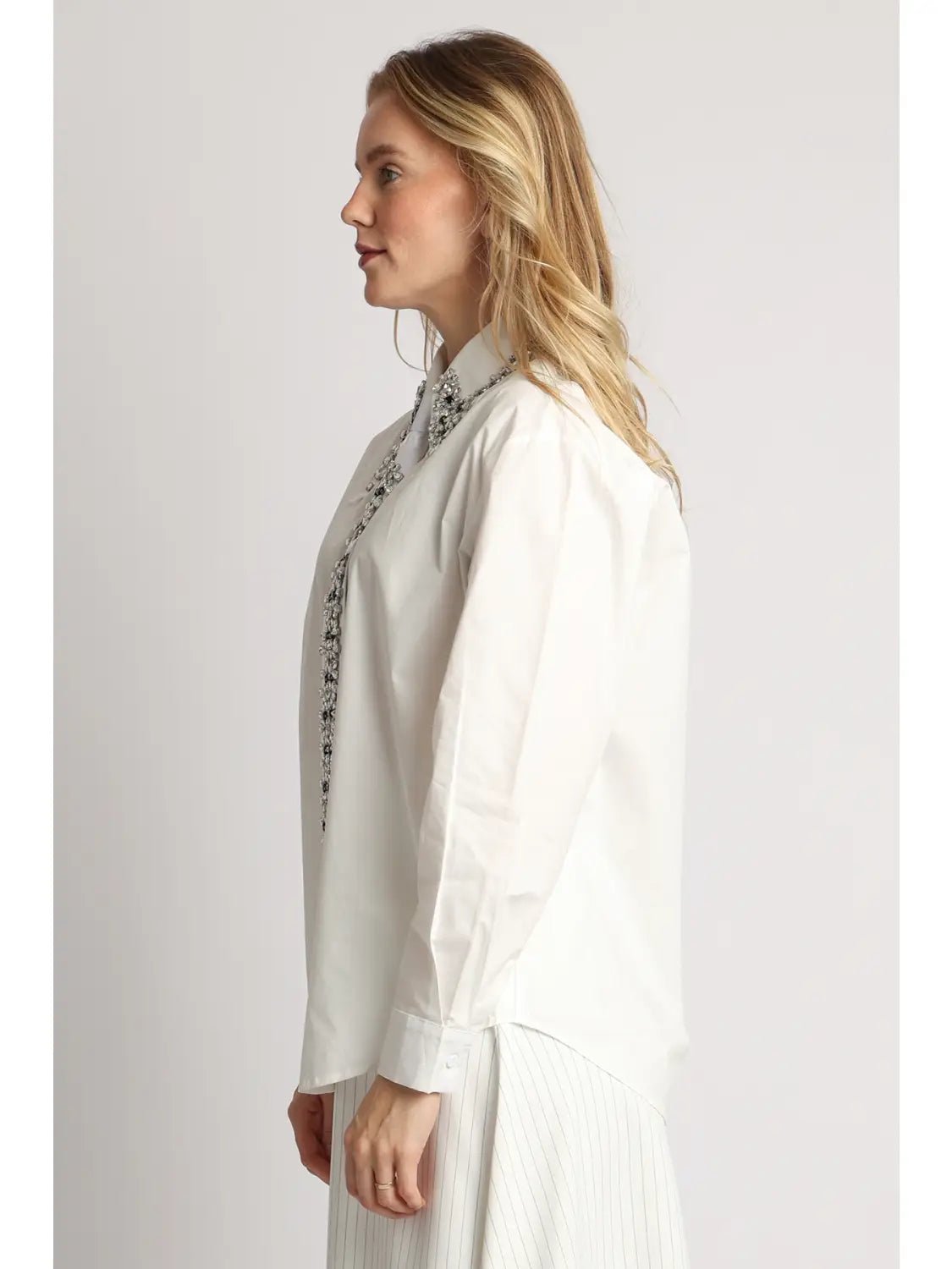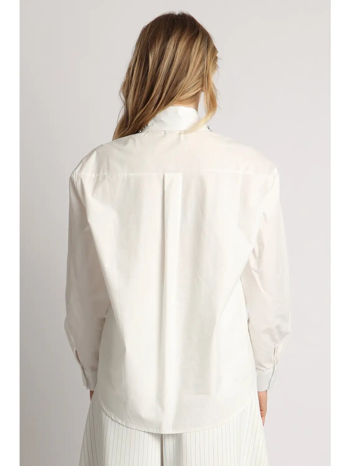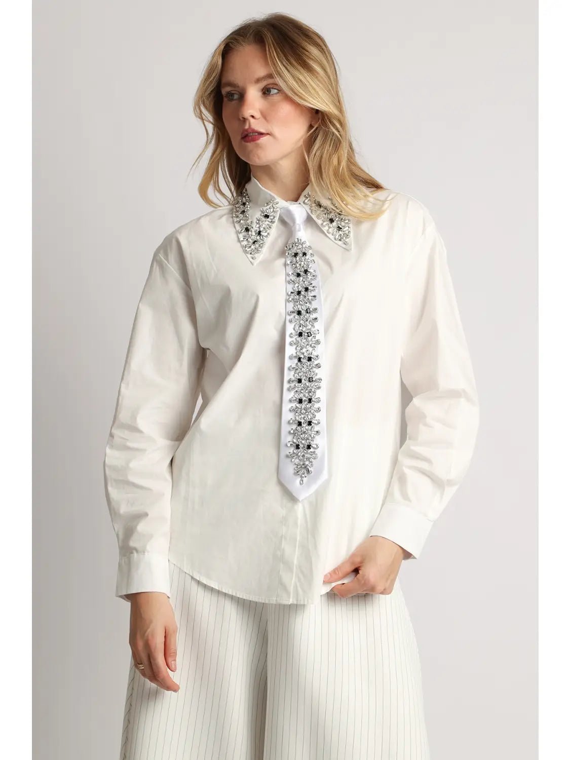 Multi-Embellished Collar & Satin Tie Button Shirt Cotton-blended fabric Faux rhinestone embellishment Satin tie included Standard collar Long sleeves Single button cuffs Front button closure Curved hem Regular fit Imported Model size 5' 11" wearing S size Caring for your clothes is caring for the environment Wash your clothes with lower temperature and delicate spin cycles. It helps to maintain the color, shape and structure of the fabric. At the same time it reduces energy consumption that is used in care processes