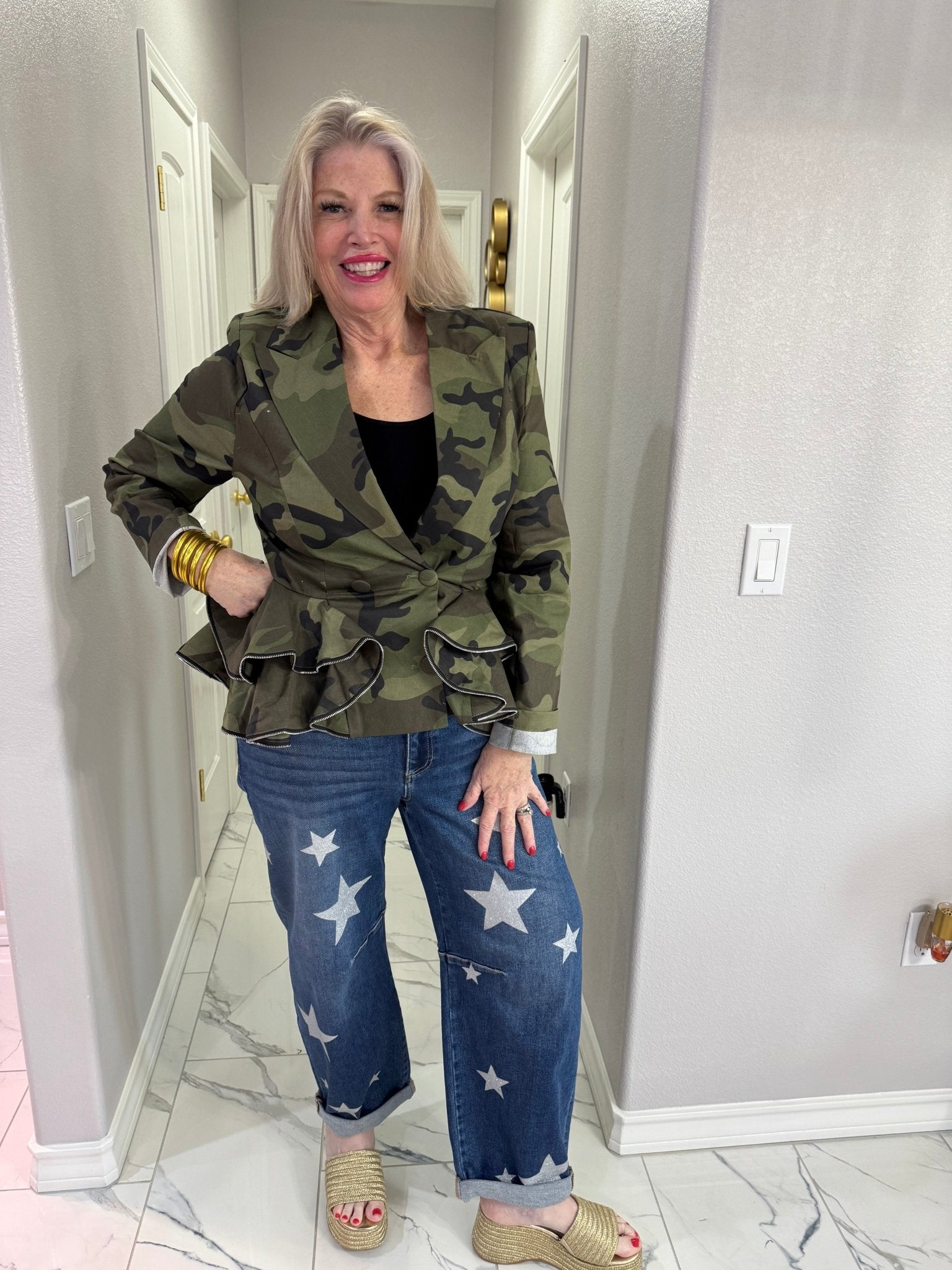 Elevate your wardrobe with this striking camo blazer designed to turn heads. The deep V-neckline creates a flattering silhouette, while long sleeves provide versatile coverage for any season. Delicate ruffles at the hem add feminine movement and dimension, and the peplum cut cinches at the waist for a polished, figure-flattering shape. A functional zipper detail at the hem offers modern edge and adjustability. Perfect for layering over basics or dressing up your everyday look, this blazer transitions seamlessly from office to evening wear.